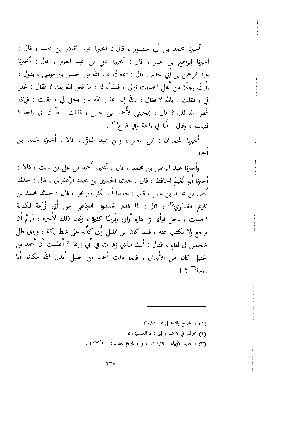 أخبرنا محمد بن أبي منصور، قال: أخبرنا عبد القادر بن محمد، قال: أخبرنا إبراهيم بن عمر، قال: أخبرنا علي بن عبد العزيز، قال: أخبرنا عبد الرحمن بن أبي حاتم، قال: سمعت عبد الله بن الحسن بن موسى، يقول: رأيت رجلاً من أهل الحديث توفي، فقلت له: ما فعل الله بك؟ فقال: غفر لي، فقلت: بالله؟ فقال: بالله إنه غفر الله عز وجل لي، فقلت: فبماذا غفر الله لك؟ قال: بمحبتي لأحمد بن حنبل، فقلت: فأنت في راحة؟ فتبسم، وقال: أنا في راحة وفي فرح.
