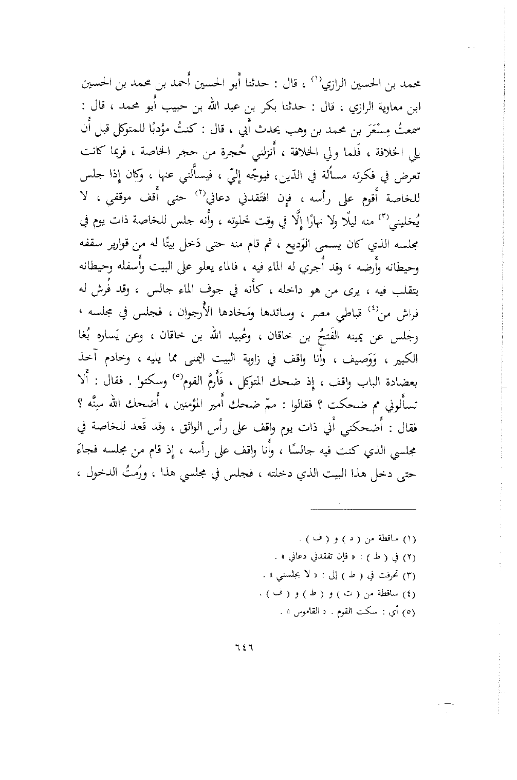 محمد بن الحسين الرازي، قال: حدثنا أبو الحسين أحمد بن محمد بن الحسين ابن معاوية الرازي، قال: حدثنا بكر بن عبد الله بن حبيب أبو محمد، قال: سمعت مسعر بن محمد بن وهب يحدث أبي، قال: كنت مؤدباً للمتوكل قبل أن يلي الخلافة، فلما ولي الخلافة، أنزلني حجرة من حجر الخاصة، فربما كانت تعرض في فكرته مسألة في الدين، فيوجه إلي، فيسألني عنها، وكان إذا جلس للخاصة أقوم على رأسه، فإن افتقدني دعاني حتى أقف موقفي، لا يخليني منه ليلاً ولا نهاراً إلا في وقت خلوته، وأنه جلس للخاصة ذات يوم في مجلسه الذي كان يسمى الوديع، ثم قام منه حتى دخل بيتاً له من قوارير سقفه وحيطانه وأرضه، وقد أجري له الماء فيه، فالماء يعلو على البيت وأسفله وحيطانه يتقلب فيه، يرى من هو داخله، كأنه في جوف الماء جالس، وقد فرش له فراش من قباطي مصر، وسائدها ومخادها الأرجوان، فجلس في مجلسه، وجلس عن يمينه الفتح بن خاقان، وعبيد الله بن خاقان، وعن يساره بغا الكبير، ووصيف، وأنا واقف في زاوية البيت اليمنى مما يليه، وخادم آخذ بعضادة الباب واقف، إذ ضحك المتوكل، فأرم القوم وسكتوا. فقال: ألا تسألوني مم ضحكت؟ فقالوا: مم ضحك أمير المؤمنين، أضحك الله سنه؟ فقال: أضحكني أني ذات يوم واقف على رأس الواثق، وقد قعد للخاصة في مجلسي الذي كنت فيه جالساً، وأنا واقف على رأسه، إذ قام من مجلسه فجاء حتى دخل هذا البيت الذي دخلته، فجلس في مجلسي هذا، ورمت الدخول،