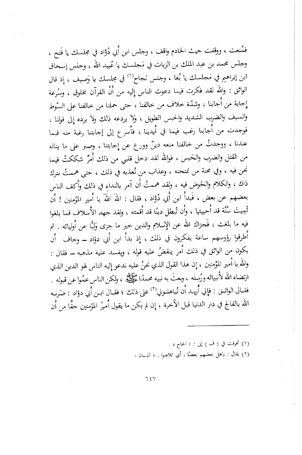 فمنعت، ووقفت حيث الخادم واقف، وجلس ابن أبي دؤاد في مجلسك يا فتح، وجلس محمد بن عبد الملك بن الزيات في مجلسك يا عبيد الله، وجلس إسحاق ابن إبراهيم في مجلسك يا بغا، وجلس نجاح في مجلسك يا وصيف، إذ قال الواثق: والله لقد فكرت فيما دعوت الناس إليه من أن القرآن مخلوق، وسرعة إجابة من أجابنا، وشدة خلاف من خالفنا، حتى حملنا من خالفنا على السوط والسيف والضرب الشديد والحبس الطويل، ولا يردعه ذلك ولا يرده إلى قولنا، فوجدت من أجابنا رغب فيما في أيدينا، فأسرع إلى إجابتنا رغبة منه فيما عندنا، ووجدت من خالفنا منعه دين وورع عن إجابتنا، وصبر على ما يناله من القتل والضرب والحبس، فوالله لقد دخل قلبي من ذلك أمر شككت فيما نحن فيه، وفي محنة من نمتحنه، وعذاب من نعذبه في ذلك، حتى هممت بترك ذاك، والكلام والخوض فيه، ولقد هممت أن آمر بالنداء في ذلك وأكف الناس بعضهم عن بعض، فبدأ ابن أبي دؤاد، فقال: الله الله يا أمير المؤمنين! أن تميت سنة قد أحييتها، وأن تبطل ديناً قد أقمته، ولقد جهد الأسلاف فما بلغوا فيه ما بلغت، فجزاك الله عن الإسلام والدين خير ما جزى ولياً عن أوليائه. ثم أطرقوا رءوسهم ساعة يفكرون في ذلك، إذ بدأ ابن أبي دؤاد- وخاف أن يكون من الواثق في ذلك أمر ينقض عليه قوله، ويفسد عليه مذهبه- فقال: والله يا أمير المؤمنين، إن هذا القول الذي نحن عليه ندعو إليه الناس لهو الدين الذي ارتضاه الله لأنبيائه ورسله، وبعث به نبيه محمداً صلى الله عليه وسلم، ولكن الناس عموا عن قبوله. فقال الواثق: فإني أريد أن تباهلوني على ذلك؛ فقال ابن أبي دؤاد: ضربه الله بالفالج في دار الدنيا قبل الآخرة، إن لم يكن ما يقول أمير المؤمنين حقاً من أن