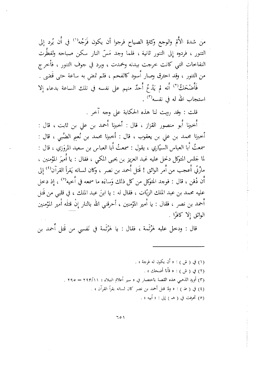 أخبرنا أبو منصور القزاز، قال: أخبرنا أحمد بن علي بن ثابت، قال: أخبرنا محمد بن علي بن يعقوب، قال: أخبرنا محمد بن نعيم الضبي، قال: سمعت أبا العباس السياري، يقول: سمعت أبا العباس بن سعيد المروزي، قال: لما جلس المتوكل دخل عليه عبد العزيز بن يحيى المكي، فقال: يا أمير المؤمنين، ما رئي أعجب من أمر الواثق! قتل أحمد بن نصر، وكان لسانه يقرأ القرآن إلى أن دفن، قال: فوجد المتوكل من كل ذلك وساءه ما سمعه في أخيه، إذ دخل عليه محمد بن عبد الملك الزيات، فقال له: يا ابن عبد الملك، في قلبي من قتل أحمد بن نصر، فقال: يا أمير المؤمنين، أحرقني الله بالنار إن قتله أمير المؤمنين الواثق إلا كافراً.
