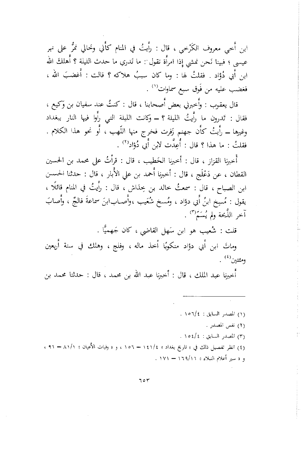 أخبرنا القزاز، قال: أخبرنا الخطيب، قال: قرأت على محمد بن الحسين القطان، عن دعلج، قال: أخبرنا أحمد بن علي الأبار، قال: حدثنا الحسن ابن الصباح، قال: سمعت خالد بن خداش، قال: رأيت في المنام قائلاً، يقول: مسخ ابن أبي دؤاد، ومسخ شعيب، وأصاب ابن سماعة فالج، وأصاب آخر الذبحة ولم يسم.