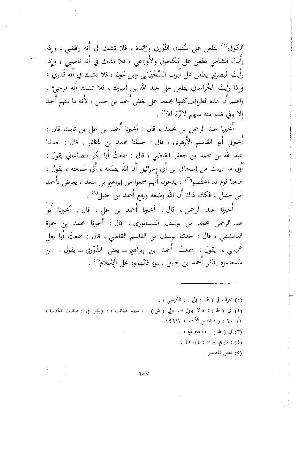 الكوفي يطعن على سفيان الثوري وزائدة، فلا تشك في أنه رافضي، وإذا رأيت الشامي يطعن على مكحول والأوزاعي، فلا تشك في أنه ناصبي، وإذا رأيت البصري يطعن على أيوب السختياني وابن عون، فلا تشك في أنه قدري، وإذا رأيت الخراساني يطعن على عبد الله بن المبارك، فلا تشك أنه مرجئ. واعلم أن هذه الطوائف كلها مجمعة على بغض أحمد بن حنبل، لأنه ما منهم أحد إلا وفي قلبه منه سههم لا برء له.