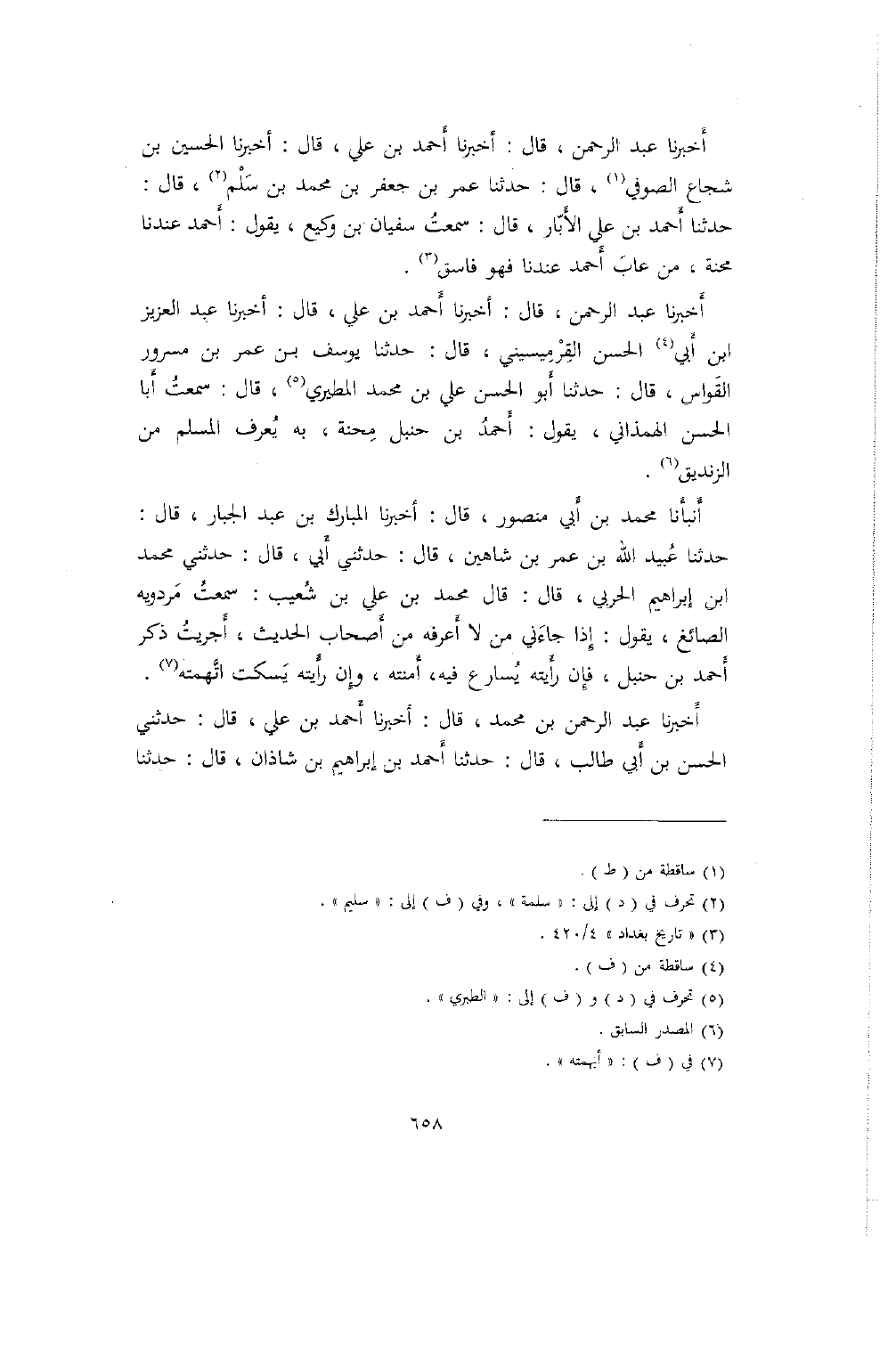 أخبرنا عبد الرحمن، قال: أخبرنا أحمد بن علي، قال: أخبرنا عبد العزيز ابن أبي الحسن القرميسيني، قال: حدثنا يوسف بن عمر بن مسرور القواس، قال: حدثنا أبو الحسن علي بن محمد المطيري، قال: سمعت أبا الحسن الهمذاني، يقول: أحمد بن حنبل محنة، به يعرف المسلم من الزنديق.
