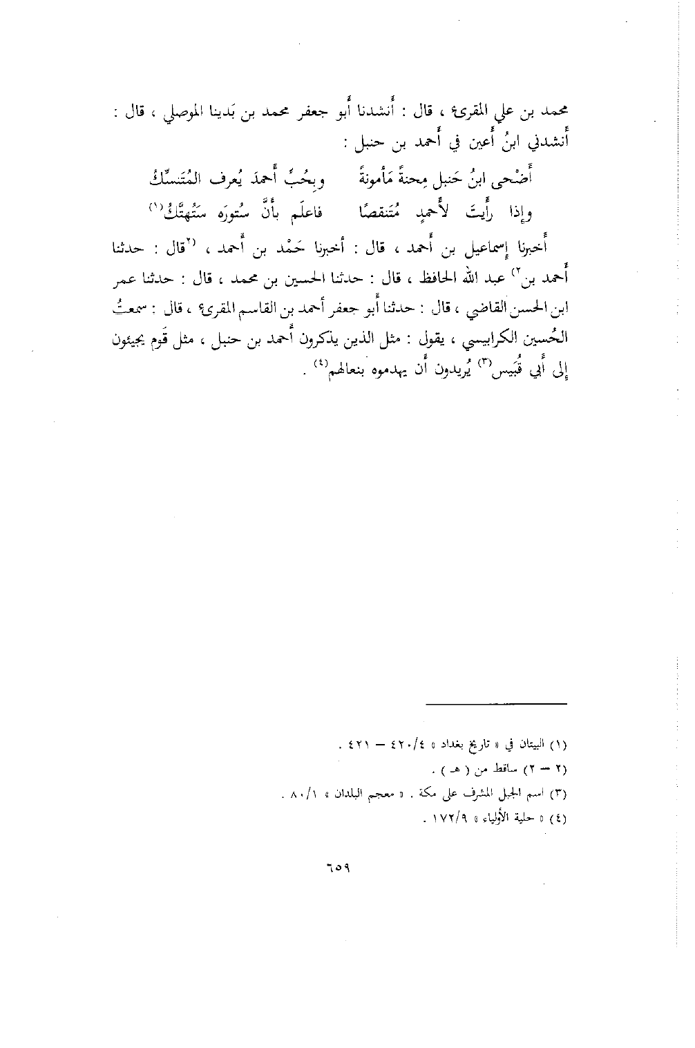 محمد بن علي المقرئ، قال: أنشدنا أبو جعفر محمد بن بدينا الموصلين قال: أنشدني ابن أعين في أحمد بن حنبل: