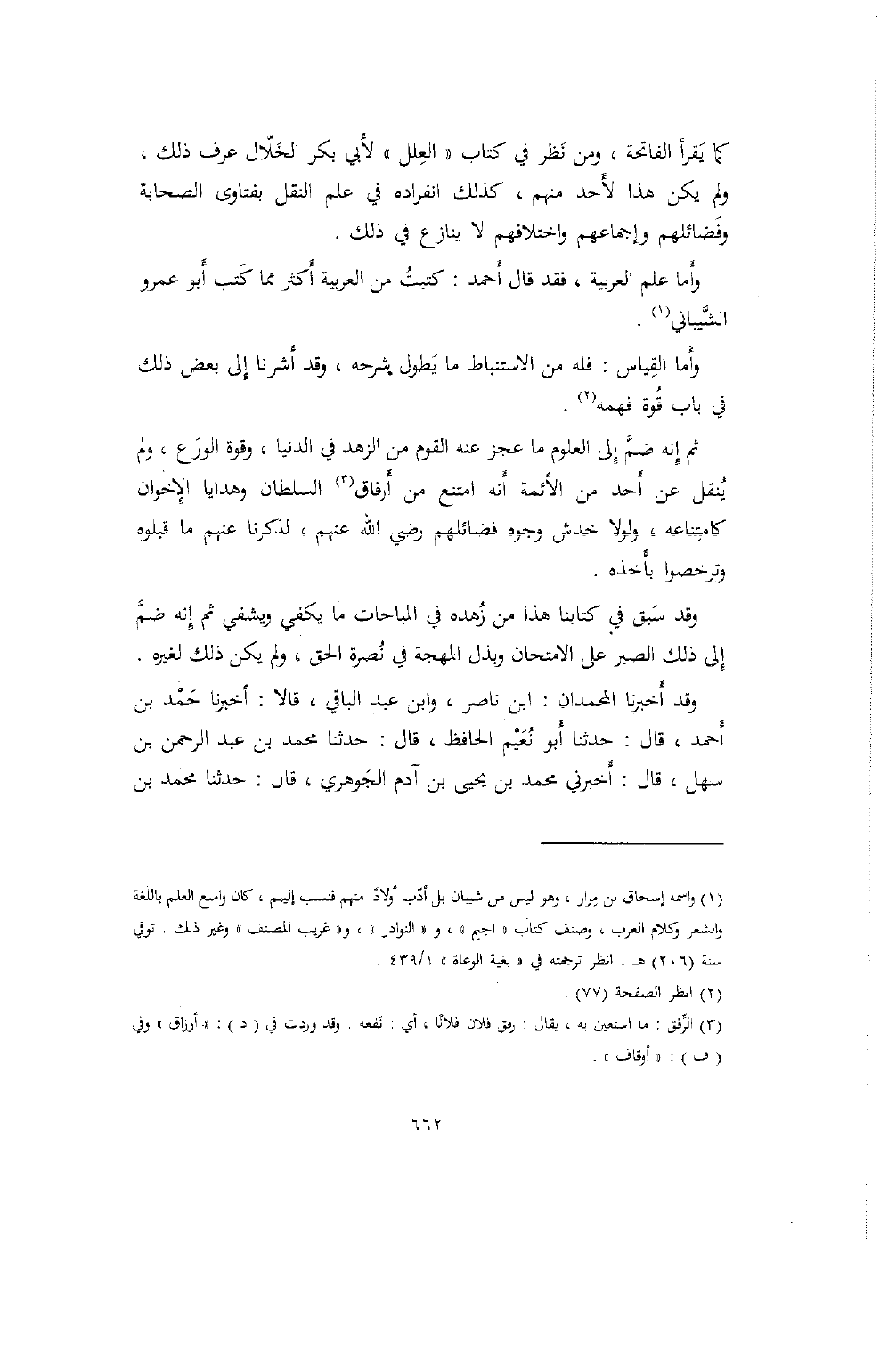 كما يقرأ الفاتحة، ومن نظر في كتاب "العلل" لأبي بكر الخلال عرف ذلك، ولم يكن هذا لأحد منهم، كذلك انفراده في علم النقل بفتاوى الصحابة وفضائلهم وإجماعهم واختلافهم لا ينازع في ذلك.