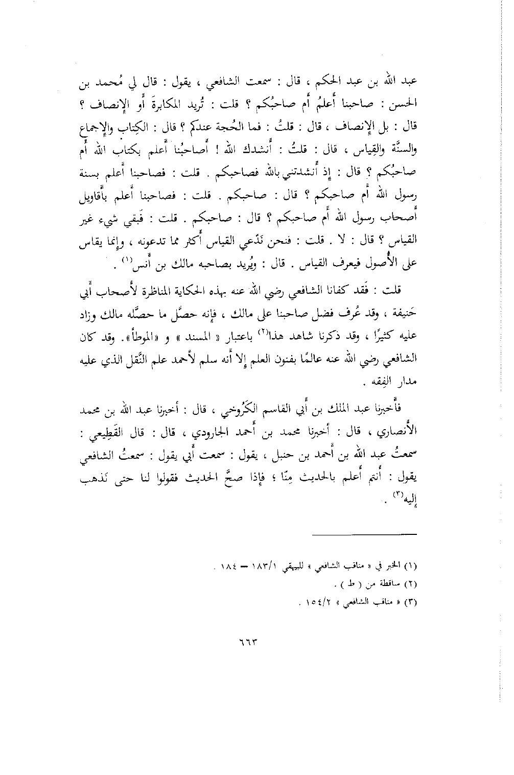 عبد الله بن عبد الحكم، قال: سمعت الشافعي، يقول: قال لي محمد بن الحسن: صاحبنا أعلم أم صاحبكم؟ قلت: تريد المكابرة أو الإنصاف؟ قال: بل الإنصاف، قال: قلت: فما الحجة عندكم؟ قال: الكتاب والإجماع والسنة والقياس، قال: قلت: أنشدك الله! أصاحبنا أعلم بكتاب الله أم صاحبكم؟ قال: إذا أنشدتني بالله فصاحبكم. قلت: فصاحبنا أعلم بسنة رسول الله أم صاحبكم؟ قال: صاحبكم. قلت: فصاحبنا أعلم بأقاويل أصحاب رسول الله أم صاحبكم؟ قال: صاحبكم. قلت: فبقي شيء غير القياس؟ قال: لا. قلت: فنحن ندعي القياس أكثر مما تدعونه، وإنما يقاس على الأصول فيعرف القياس. قال: ويريد بصاحبه مالك بن أنس.