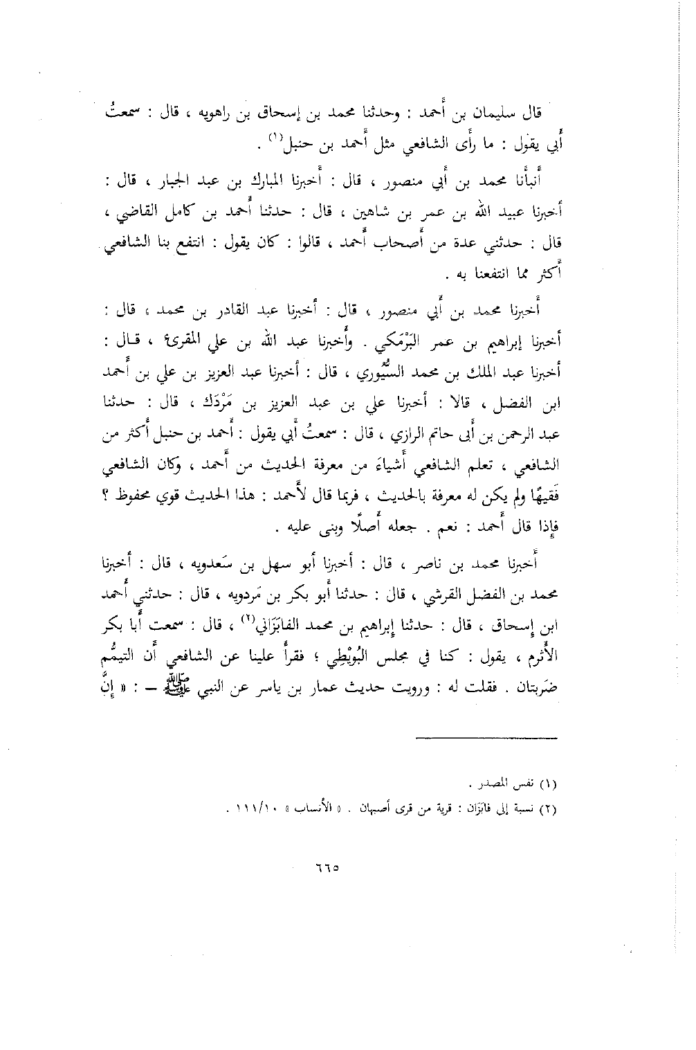 أخبرنا محمد بن أبي منصور، قال: أخبرنا عبد القادر بن محمد، قال: أخبرنا إبراهيم بن عمر البرمكي. وأخبرنا عبد الله بن علي المقرئ، قال: أخبرنا عبد الملك بن محمد السيوري، قال: أخبرنا عبد العزيز بن علي بن أحمد ابن الفضل، قالا: أخبرنا علي بن عبد العزيز بن مردك، قال: حدثنا عبد الرحمن بن أبي حاتم الرازي، قال: سمعت أبي يقول: أحمد بن حنبل أكثر من الشافعي، تعلم الشافعي أشياء من معرفة الحديث من أحمد، وكان الشافعي فقيهاً ولم يكن له معرفة بالحديث، فربما قال لأحمد: هذا الحديث قوي محفوظ؟ فإذا قال أحمد: نعم. جعله أصلاً وبنى عليه.