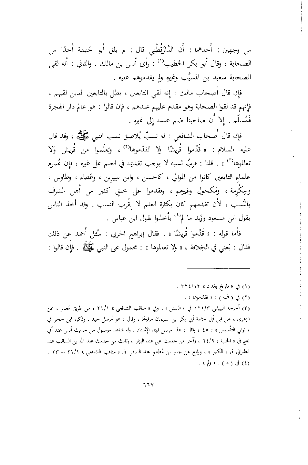 فإن قال أصحاب الشافعي: له نسب يلاصق نسب النبي صلى الله عليه وسلم، وقد قال عليه السلام: "قدموا قريشاً ولا تقدموها، وتعلموا من قريش ولا تعالموها". قلنا: قرب نسبه لا يوجب تقديمه في العلم على غيره، فإن عموم علماء التابعين كانوا من الموالي، كالحسن، وابن سيرين، وعطاء، وطاوس، وعكرمة، ومكحول وغيرهم، وتقدموا على خلق كثير من أهل الشرف بالنسب، لأن تقدمهم كان بكثرة العلم لا بقرب النسب. وقد أخذ الناس بقول ابن مسعود وزيد ما لم يأخذوا بقول ابن عباس.