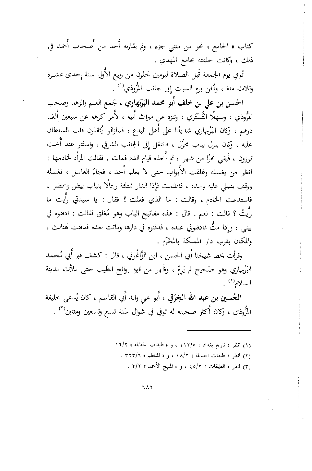 الحسن بن على بن خلف أبو محمد البَرْبَهارى, جَمع العلم والزهد وصحب المرُّوذى, وسهلًا التُّسْتُرى, وتنزه عن ميراث أبيه, لأمر كرهه عن سبعين ألف درهم, وكان البَرْبهارى شديدًا على أهل البدع, فما زالوا يُثقلون قلب السلطان عليه, وكان ينزل بباب محوَل, فانتقل إلى الجانب الشرقى, واستتر عند أخت توزون, فَبقى نحوًا من شهر, ثم أخذه قيام الدم فمات, فقالت المرأة لخادمها: انظر من يغسله وغلقت الأبواب حتى لا يعلم أحد, فجاءَ الغاسل, فغسله ووقف يصلى عليه وحده, فاطلعت فإذا الدار ممتلئة رجالًا بثياب بيض وخضر, فاستدعت الخادم, وقالت: ما الذى فعلت؟ فقال: يا سيدتى رأيت ما رأيتُ؟ قالت: نعم. قال: هذه مفاتيح الباب وهو مغلق فقالت: ادفنوه فى بيتى, وإذام متُ فادفنونى عنده, فدفنوه فى دارها وماتت بعده فدفنت هنالك, والمكان بقرب دار المملكة بقرب دار المملكة بالمخَرّم.