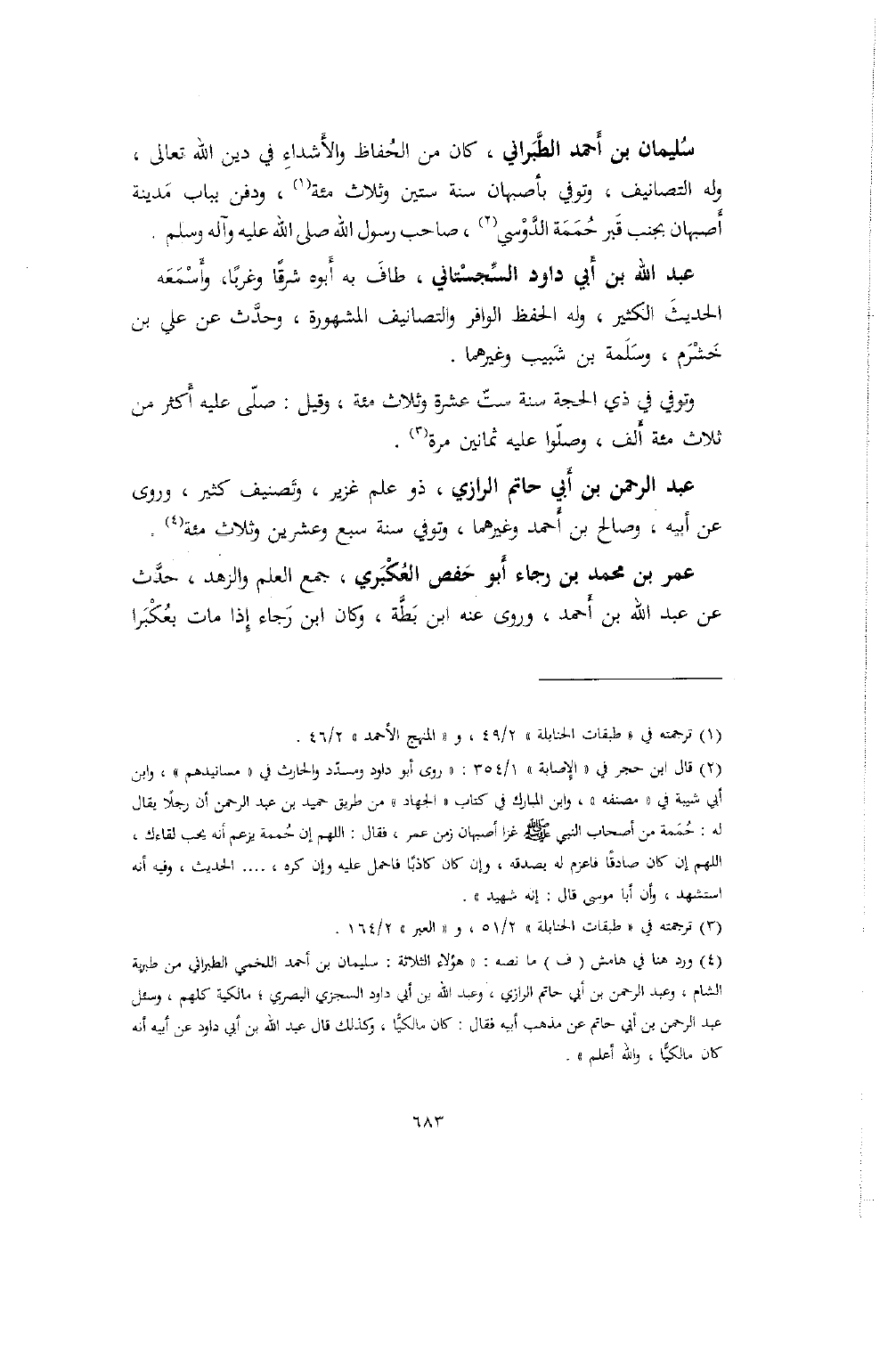 سُليمان بن أحمد الطَّبرانى, كان من الحُفاظ والأشداء فى دين الله تعالى, وله التصانيف, وتوفى بأصبهان سنة ستين وثلاث مئة, ودفن بباب مَدينة أصبهان بجنب قبر حُممة الدَّوسى, صاحب رسول الله صلى الله عليه وآله وسلم.