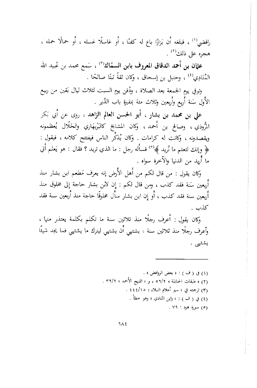 عثمان بن أحمد الدقاق المعروف بابن السمّاك, سَمع محمد بن عُبيد الله المُنّادِى, وحنبل بن إسحاق, وكان ثقةّ ثبتًا صالحًا.