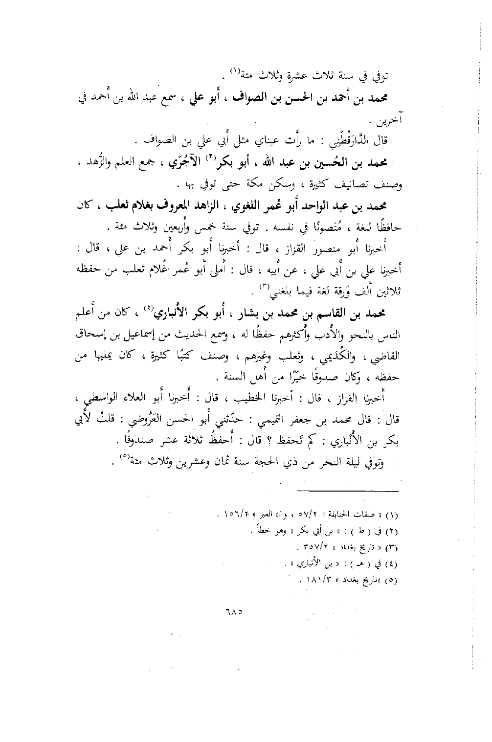 محمد بن القاسم بن محمد بن بشار, أبو بكر الأنبارى, كان من أعلم الناس بالنحو والأدب وأكثرهم حفظًا له, وسمع الحديث من إسماعيل بن إسحاق القاضى, والكُدَيمى, وثعلب وغيرهم, وصنف كتبًا كثيرة, كان يمليها من حفظه, وكان صدوقًا خيرًا من أهل السنة.