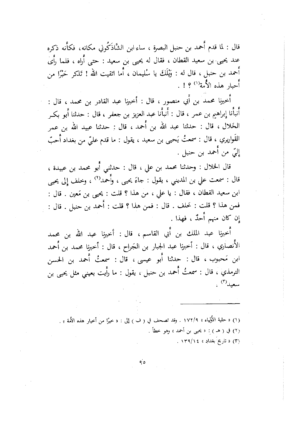 أَخبرنا عبد الملك بن أَبي القاسم، قال: أخبرنا عبد الله بن محمد الأَنصاري، قال: أخبرنا عبد الجبار بن الجَراح، قال: أخبرنا محمد بن أَحمد ابن مَحبوب، قال: حدثنا أَبو عيسى، قال: سمعتُ أَحمد بن الحسن الترمذي، قال: سمعتُ أَحمد بن حنبل، يقول: ما رأَيت بعيني مثل يحيى بن سعيد.