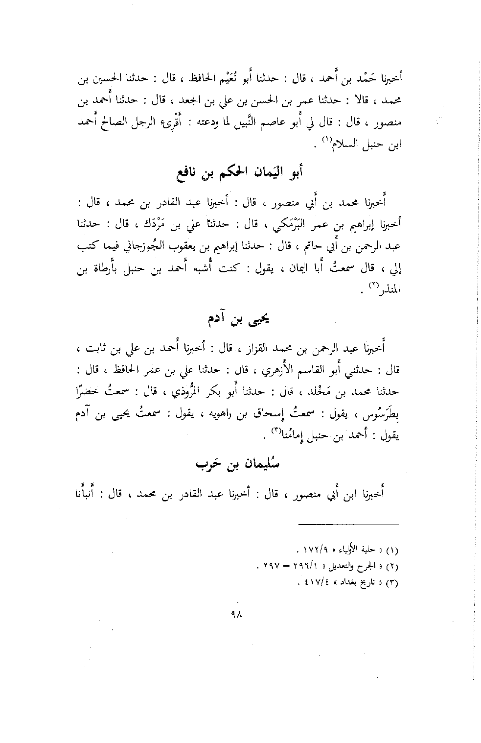 أَخبرنا عبد الرحمن بن محمد القزاز، قال: أخبرنا أَحمد بن علي بن ثابت، قال: حدثني أَبو القاسم الأَزهري، قال: حدثنا علي بن عمر الحافظ، قال: حدثنا محمد بن مَخْلد، قال: حدثنا أَبو بكر المرُّوذي، قال: سمعتُ خضراً بِطَرَسُوس، يقول: سمعتُ إِسحاق بن راهويه، يقول: سمعتُ يحيى بن آدم يقول: أحمد بن حنبل إِمامُنا.