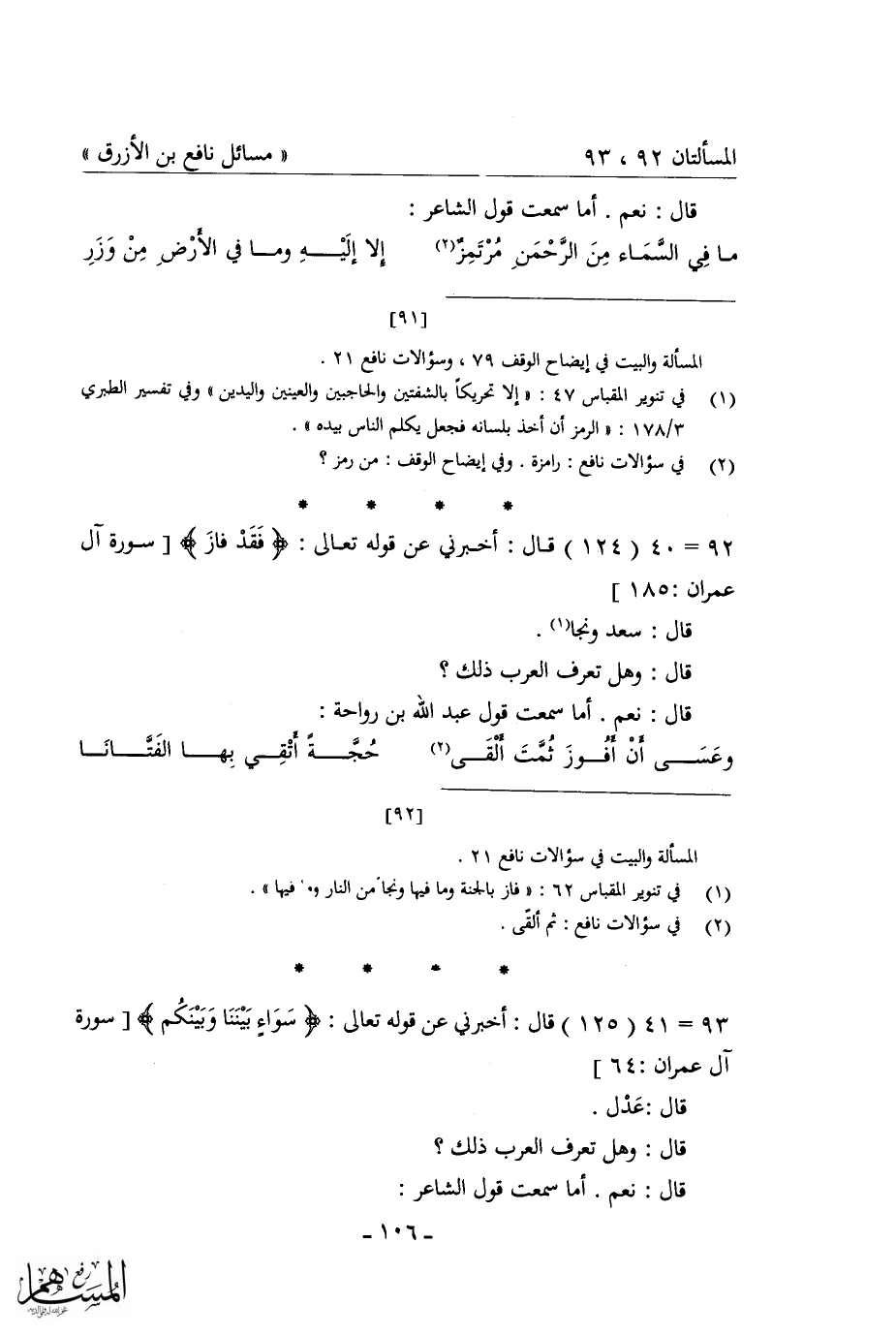 كتاب مسائل نافع بن الأزرق = غريب القرآن في شعر العرب