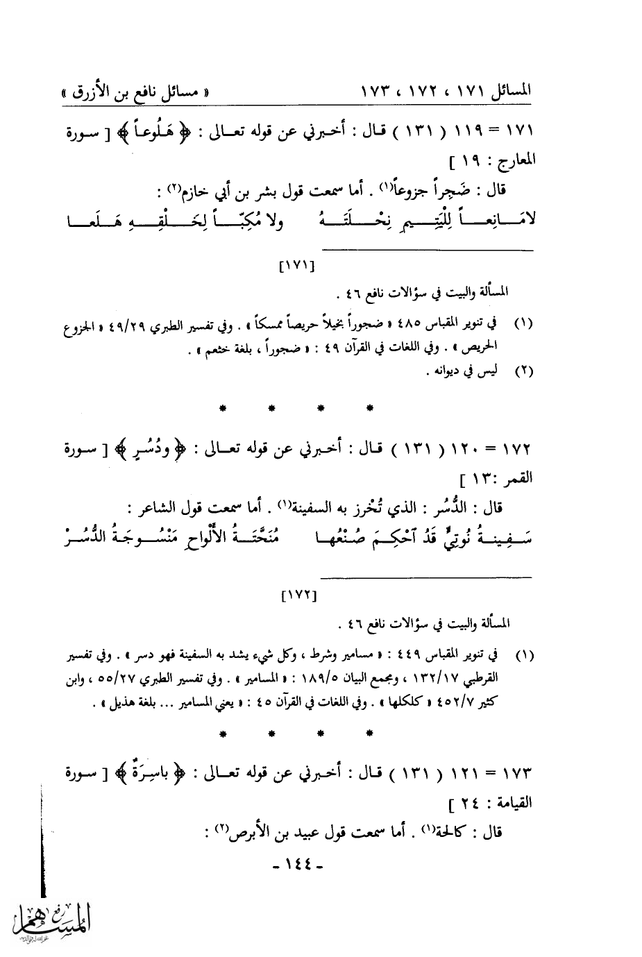 كتاب مسائل نافع بن الأزرق = غريب القرآن في شعر العرب