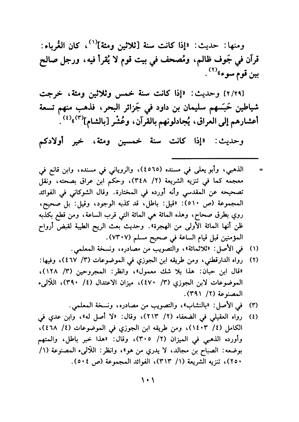 = الذهبي، وأبو يعلى في مسنده (٤٥٦٥)، والروياني في مسنده، وابن قانع في معجمه كما في تنزيه الشريعة (٢/ ٣٤٨)، وحكم ابن عراق بصحته، ونقل تصحيحه عن المقدسي وأنه أورده في المختارة. وقال الشوكاني في الفوائد المجموعة (ص ٥١٠): "قيل: باطل، قد كذبه الوجود، وقيل: بل صحيح، روي بطرق صحاح، وهذه المائة هي المائة التي قرب الساعة، ومن قطع بكذبه ظن أنها المائة الأولى من الهجرة". وحديث بعث الريح الطيبة لقبض أرواح المؤمنين قبل قيام الساعة في صحيح مسلم (٧٣٠٧).