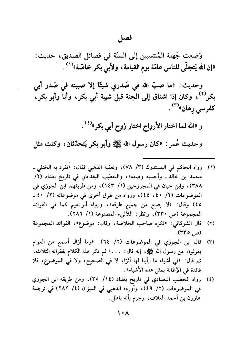 وَضعت جَهلة المُنتسبين إلى السنّة في فضائل الصديق، حديث: "إن الله يَتجلّى للناس عامّة يوم القيامة، ولأبي بكر خاصّة" (¬١).