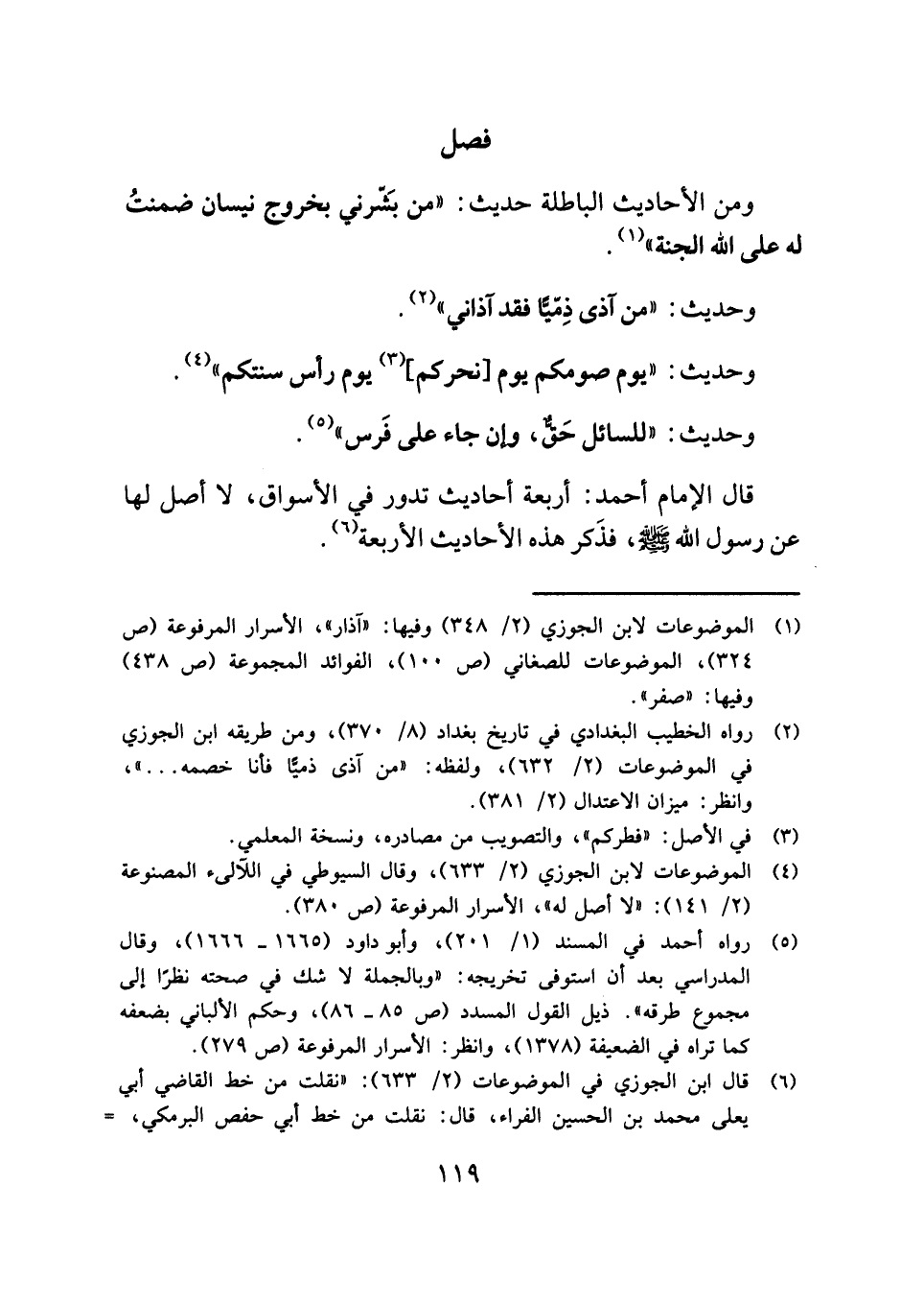 قال الإمام أحمد: أربعة أحاديث تدور في الأسواق، لا أصل لها عن رسول الله - صلى الله عليه وسلم -، فذَكر هذه الأحاديث الأربعة (¬٦).