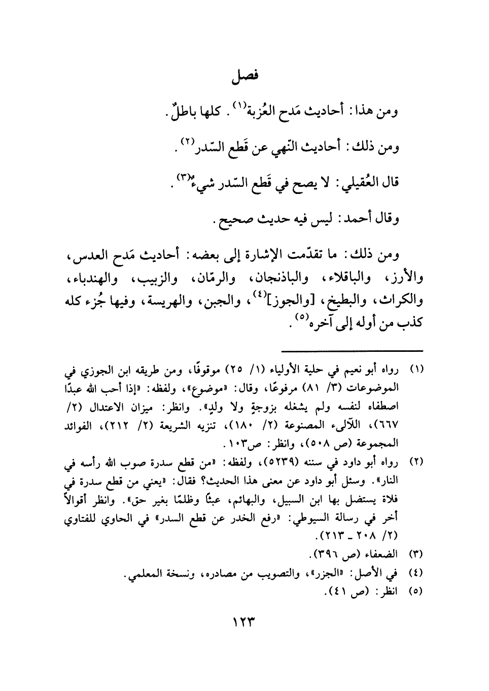 ومن ذلك؛ ما تقدّمت الإشارة إلى بعضه: أحاديث مَدح العدس، والأرز، والباقلاء، والباذنجان، والرمّان، والزبيب، والهندباء، والكراث، والبطيخ، [والجوز] (¬٤)، والجبن، والهريسة، وفيها جُزء كله كذب من أوله إلى آخره (¬٥).