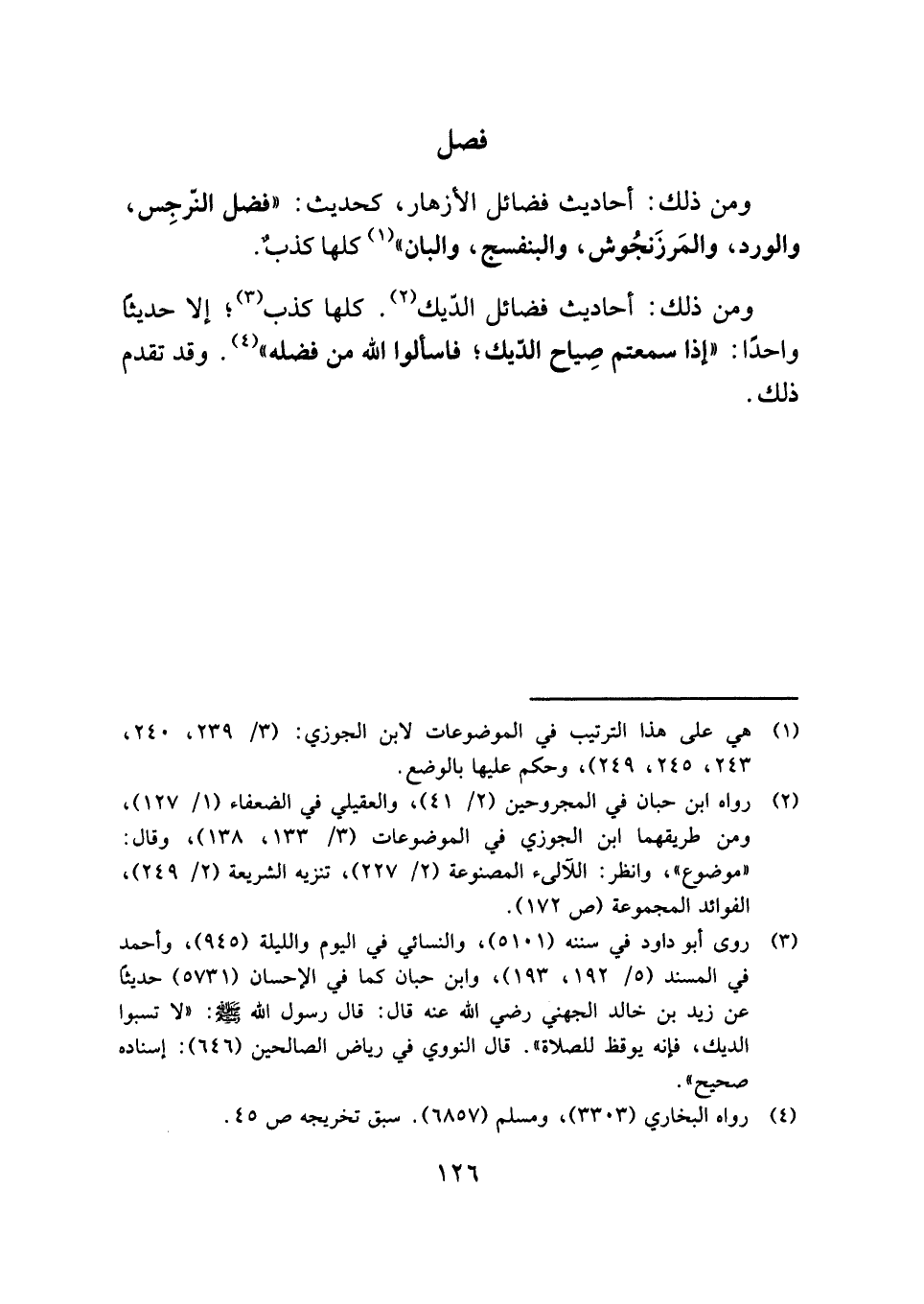 ومن ذلك: أحاديث فضائل الأزهار، كحديث: "فضل النّرجِس، والورد، والمَرزَنجُوش، والبنفسج، والبان" (¬١) كلها كذبٌ.