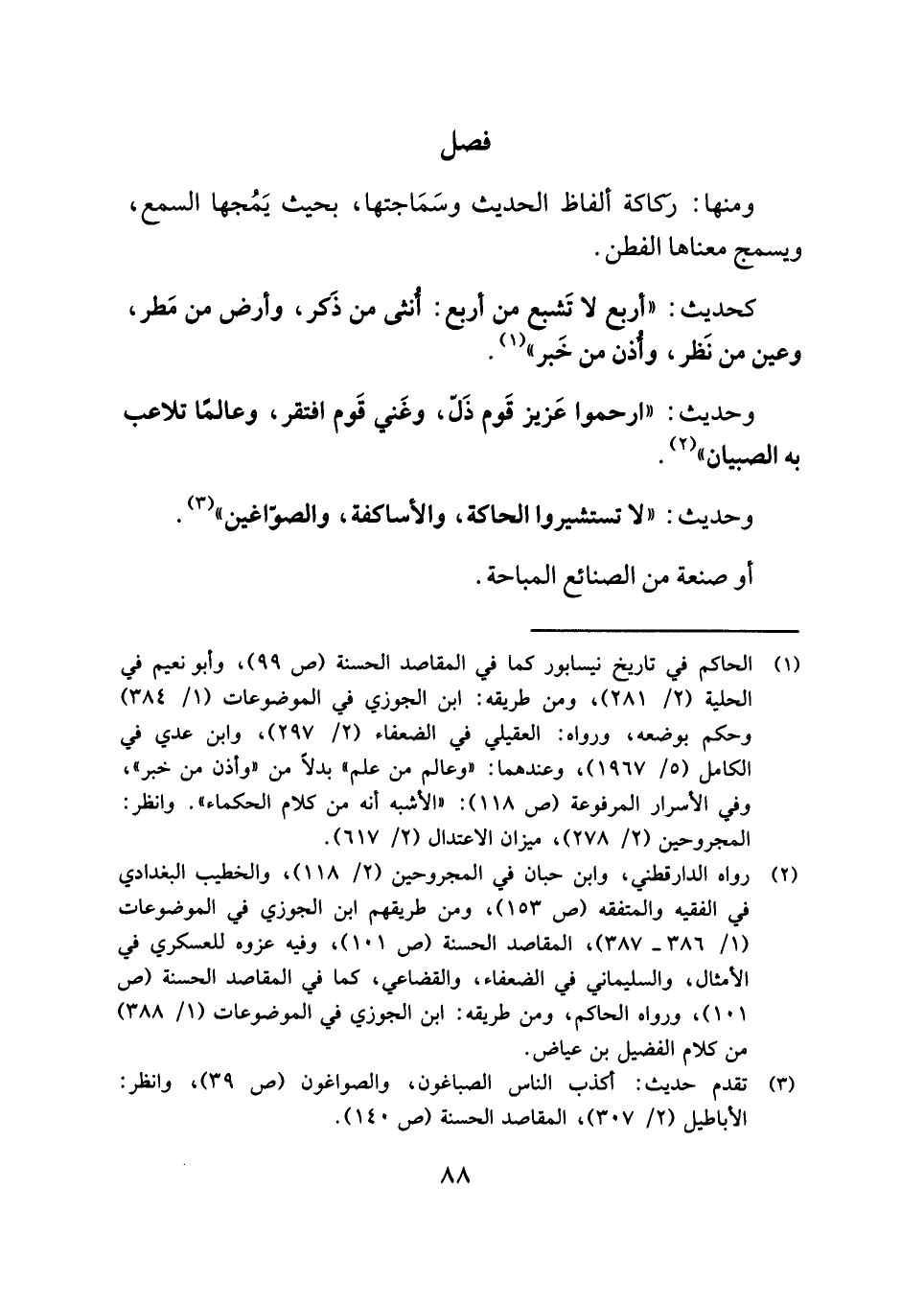 كحديث: "أربع لا تَشبع من أربع: أُنثى من ذَكر، وأرض من مَطر، وعين من نَظر، وأُذن من خَبر" (¬١).
