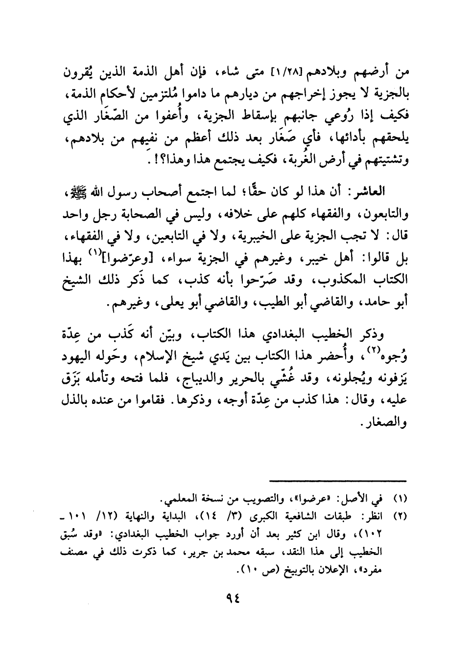 العاشر: أن هذا لو كان حقًّا؛ لما اجتمع أصحاب رسول الله - صلى الله عليه وسلم -، والتابعون، والفقهاء كلهم على خلافه، وليس في الصحابة رجل واحد قال: لا تجب الجزية على الخيبرية، ولا في التابعين، ولا في الفقهاء، بل قالوا: أهل خيبر، وغيرهم في الجزية سواء، [وعرّضوا] (¬١) بهذا الكتاب المكذوب، وقد صرّحوا بأنه كذب، كما ذَكر ذلك الشيخ أبو حامد، والقاضي أبو الطيب، والقاضي أبو يعلى، وغيرهم.