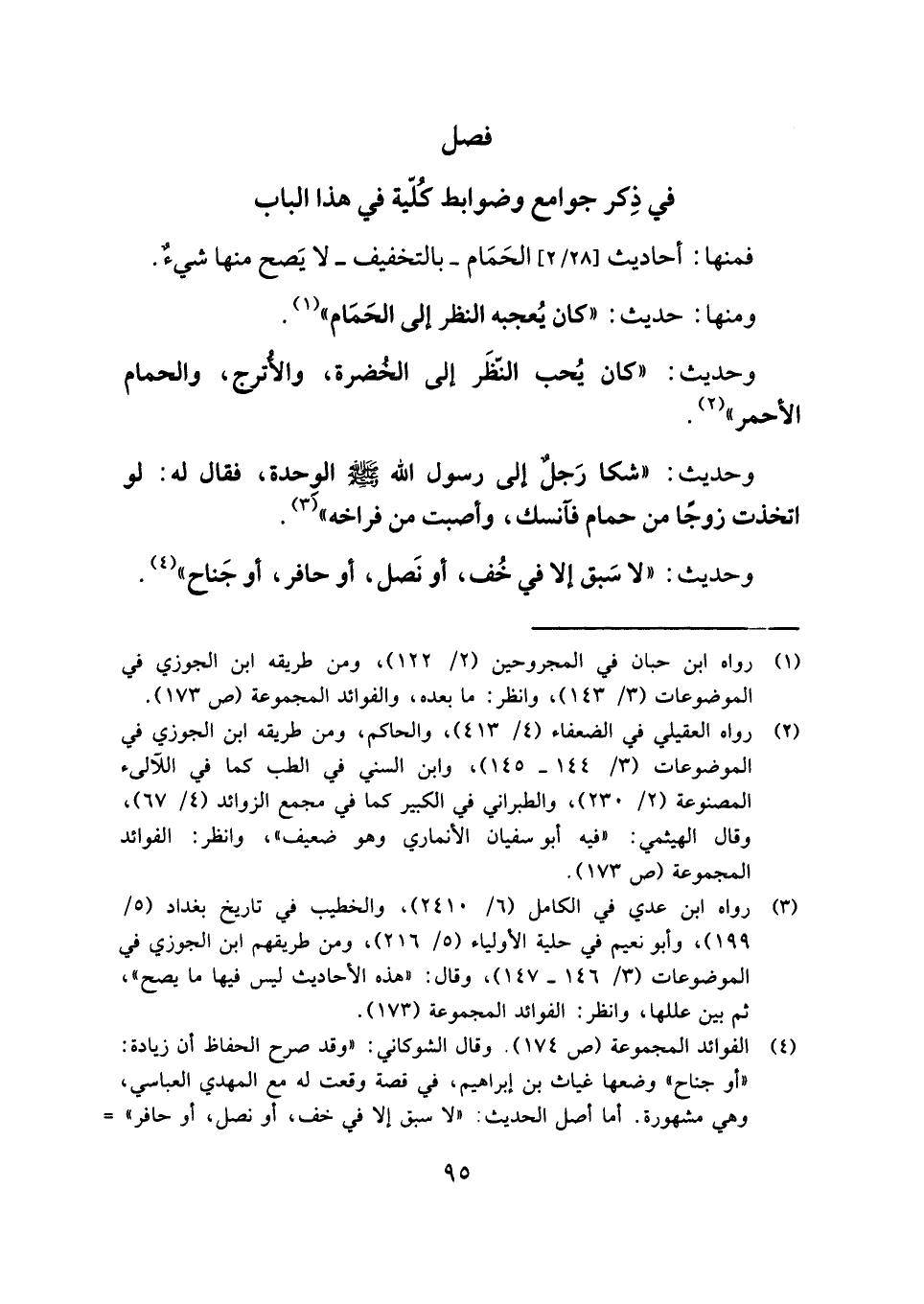(¬٤) الفوائد المجموعة (ص ١٧٤). وقال الشوكاني: "وقد صرح الحفاظ أن زيادة: "أو جناح" وضعها غياث بن إبراهيم، في قصة وقعت له مع المهدي العباسي، وهي مشهورة. أما أصل الحديث: "لا سبق إلا في خف، أو نصل، أو حافر" =