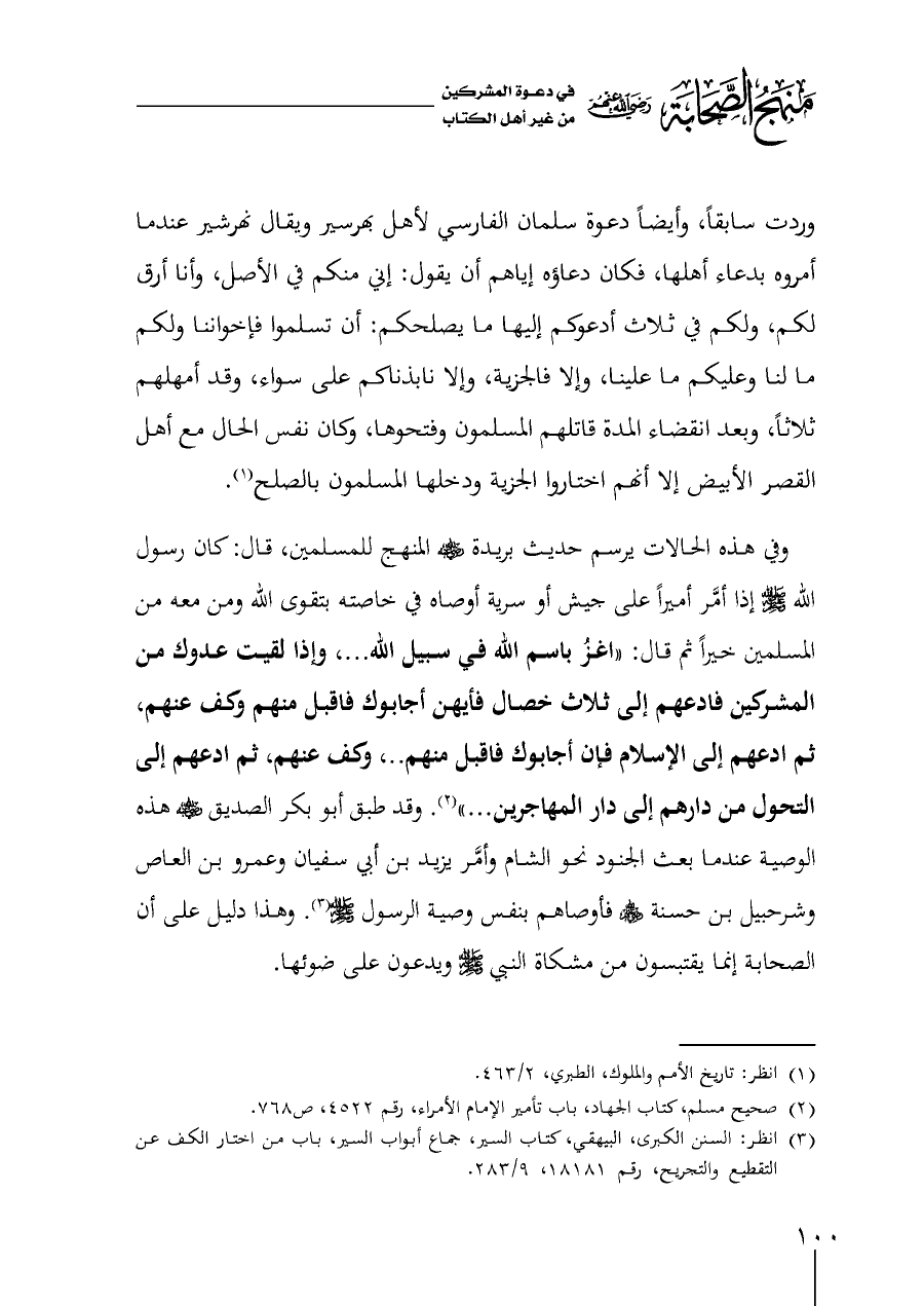 وفي هذه الحالات يرسم حديث بريدة - رضي الله عنه - المنهج للمسلمين، قال: كان رسول الله - صلى الله عليه وسلم - إذا أمَّر أميراً على جيش أو سرية أوصاه في خاصته بتقوى الله ومن معه من المسلمين خيراً ثم قال: (اغزُ باسم الله في سبيل الله ... ، وإذا لقيت عدوك من المشركين فادعهم إلى ثلاث خصال فأيهن أجابوك فاقبل منهم وكف عنهم، ثم ادعهم إلى الإسلام فإن أجابوك فاقبل منهم .. ، وكف عنهم، ثم ادعهم إلى التحول من دارهم إلى دار المهاجرين ... ((¬٢). وقد طبق أبو بكر الصديق - رضي الله عنه - هذه الوصية عندما بعث الجنود نحو الشام وأمَّر يزيد بن أبي سفيان وعمرو بن العاص وشرحبيل بن حسنة - رضي الله عنهم - فأوصاهم بنفس وصية الرسول - صلى الله عليه وسلم - (¬٣). وهذا دليل على أن الصحابة إنما يقتبسون من مشكاة النبي - صلى الله عليه وسلم - ويدعون على ضوئها.