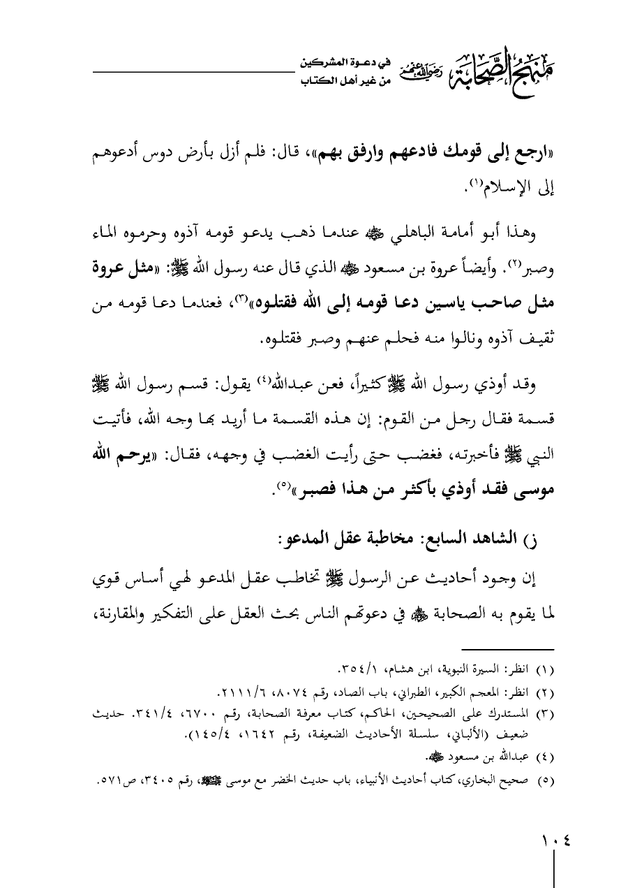 وهذا أبو أمامة الباهلي - رضي الله عنه - عندما ذهب يدعو قومه آذوه وحرموه الماء وصبر (¬٢). وأيضاً عروة بن مسعود - رضي الله عنه - الذي قال عنه رسول الله - صلى الله عليه وسلم -: (مثل عروة مثل صاحب ياسين دعا قومه إلى الله فقتلوه ((¬٣)، فعندما دعا قومه من ثقيف آذوه ونالوا منه فحلم عنهم وصبر فقتلوه.