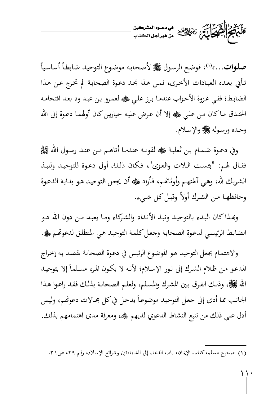 صلوات ... ((¬١)، فوضع الرسول - صلى الله عليه وسلم - لأصحابه موضوع التوحيد ضابطاً أساسياً تأتي بعده العبادات الأخرى، فمن هذا نجد دعوة الصحابة لم تخرج عن هذا الضابط؛ ففي غزوة الأحزاب عندما برز علي - رضي الله عنه - لعمرو بن عبد ود بعد اقتحامه الخندق ما كان من علي - رضي الله عنه - إلا أن عرض عليه خيارين كان أولهما دعوة إلى الله وحده ورسوله - صلى الله عليه وسلم - والإسلام.