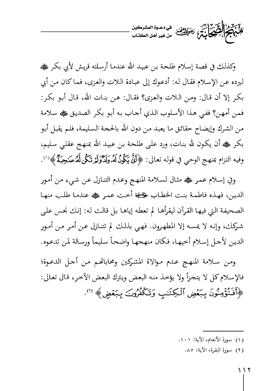 وكذلك في قصة إسلام طلحة بن عبيد الله عندما أرسلته قريش لأبي بكر - رضي الله عنه - ليرده عن الإسلام فقال له: أدعوك إلى عبادة اللات والعزى، فما كان من أبي بكر إلا أن قال: ومن اللات والعزى؟ فقال: هن بنات الله، قال أبو بكر: فمن أمهن؟ ففي هذا الأسلوب الذي أجاب به أبو بكر الصديق - رضي الله عنه - سلامة من الشرك وإيضاح حقائق ما يعبد من دون الله بالحجة السليمة، فلم يقبل أبو بكر - رضي الله عنه - أن يكون لله بنات، ورد على طلحة بن عبيد الله بمنهج عقلي سليم، وفيه التزام بمنهج الوحي في قوله تعالى: {أَنَّى يَكُونُ لَهُ وَلَدٌ وَلَمْ تَكُنْ لَهُ صَاحِبَةٌ} (¬١).