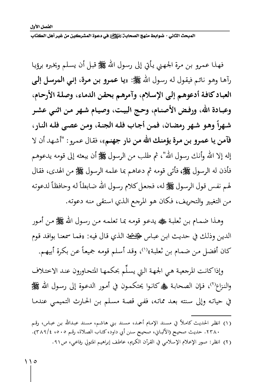 فهذا عمرو بن مرة الجهني يأتي إلى رسول الله - صلى الله عليه وسلم - قبل أن يسلم ويخبره برؤيا رآها وهو نائم فيقول له رسول الله - صلى الله عليه وسلم -: (يا عمرو بن مرة، إني المرسل إلى العباد كافة أدعوهم إلى الإسلام، وآمرهم بحقن الدماء، وصلة الأرحام، وعبادة الله، ورفض الأصنام، وحج البيت، وصيام شهر من اثني عشر شهراً وهو شهر رمضان، فمن أجاب فله الجنة، ومن عصى فله النار، فآمن يا عمرو بن مرة يؤمنك الله من نار جهنم (، فقال عمرو: "أشهد أن لا إله إلا الله وأنك رسول الله"، ثم طلب من الرسول - صلى الله عليه وسلم - أن يبعثه إلى قومه يدعوهم فأذن له الرسول - صلى الله عليه وسلم -، فأتى قومه ثم دعاهم بما علمه الرسول - صلى الله عليه وسلم - من الهدى، فقال لهم نفس قول الرسول - صلى الله عليه وسلم - له، فجعل كلام رسول الله ضابطاً له وحافظاً لدعوته من التغيير والتحريف، فكانت هي المرجع الذي استقى منها دعوته.