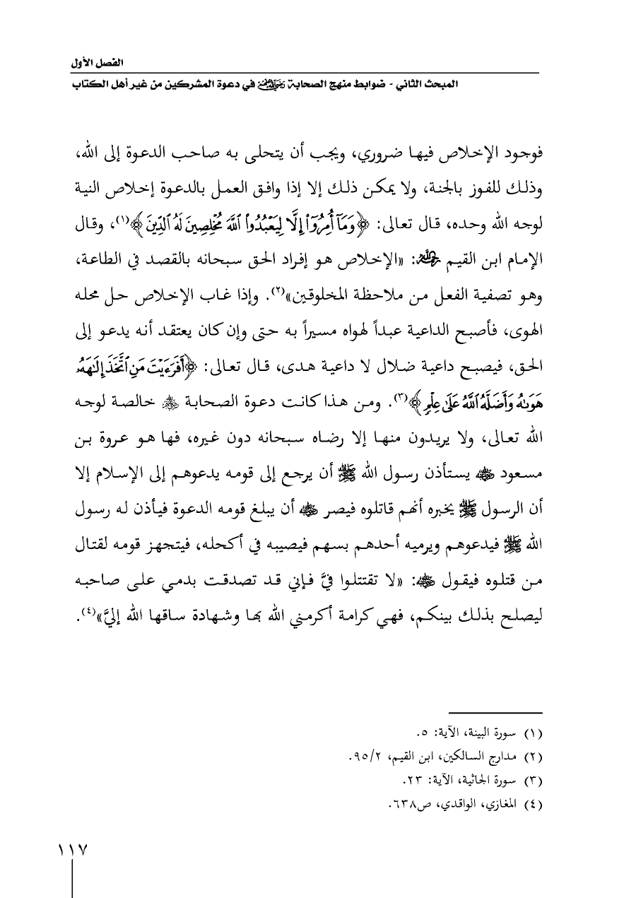 فوجود الإخلاص فيها ضروري، ويجب أن يتحلى به صاحب الدعوة إلى الله، وذلك للفوز بالجنة، ولا يمكن ذلك إلا إذا وافق العمل بالدعوة إخلاص النية لوجه الله وحده، قال تعالى: {وَمَا أُمِرُوا إِلَّا لِيَعْبُدُوا اللَّهَ مُخْلِصِينَ لَهُ الدِّينَ} (¬١)، وقال الإمام ابن القيم - رحمه الله -: "الإخلاص هو إفراد الحق سبحانه بالقصد في الطاعة، وهو تصفية الفعل من ملاحظة المخلوقين" (¬٢). وإذا غاب الإخلاص حل محله الهوى، فأصبح الداعية عبداً لهواه مسيراً به حتى وإن كان يعتقد أنه يدعو إلى الحق، فيصبح داعية ضلال لا داعية هدى، قال تعالى: {أَفَرَأَيْتَ مَنِ اتَّخَذَ إِلَهَهُ هَوَاهُ وَأَضَلَّهُ اللَّهُ عَلَى عِلْمٍ} (¬٣). ومن هذا كانت دعوة الصحابة - رضي الله عنهم - خالصة لوجه الله تعالى، ولا يريدون منها إلا رضاه سبحانه دون غيره، فها هو عروة بن مسعود - رضي الله عنه - يستأذن رسول الله - صلى الله عليه وسلم - أن يرجع إلى قومه يدعوهم إلى الإسلام إلا أن الرسول - صلى الله عليه وسلم - يخبره أنهم قاتلوه فيصر - رضي الله عنه - أن يبلغ قومه الدعوة فيأذن له رسول الله - صلى الله عليه وسلم - فيدعوهم ويرميه أحدهم بسهم فيصيبه في أكحله، فيتجهز قومه لقتال من قتلوه فيقول - رضي الله عنه -: "لا تقتتلوا فيَّ فإني قد تصدقت بدمي على صاحبه ليصلح بذلك بينكم، فهي كرامة أكرمني الله بها وشهادة ساقها الله إليَّ" (¬٤).