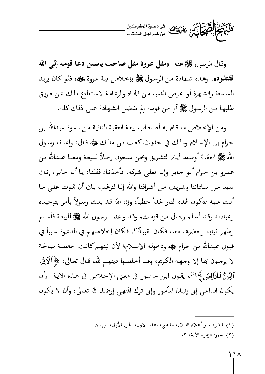 ومن الإخلاص ما قام به أصحاب بيعة العقبة الثانية من دعوة عبدالله بن حرام إلى الإسلام وذلك في حديث كعب بن مالك - رضي الله عنه - قال: واعدنا رسول الله - صلى الله عليه وسلم - العقبة أوسط أيام التشريق ونحن سبعون رجلاً للبيعة ومعنا عبدالله بن عمرو بن حرام أبو جابر وإنه لعلى شركه، فأخذناه فقلنا: يا أبا جابر، إنك سيد من ساداتنا وشريف من أشرافنا والله إنا لنرغب بك أن تموت على ما أنت عليه فتكون لهذه النار غداً حطباً، وإن الله قد بعث رسولاً يأمر بتوحيده وعبادته وقد أسلم رجال من قومك، وقد واعدنا رسول الله - صلى الله عليه وسلم - للبيعة فأسلم وطهر ثيابه وحضرها معنا فكان نقيباً (¬١). فكان إخلاصهم في الدعوة سبباً في قبول عبدالله بن حرام - رضي الله عنه - ودخوله الإسلام؛ لأن نيتهم كانت خالصة صالحة لا يرجون بها إلا وجهه الكريم، وقد أخلصوا دينهم لله، قال تعالى: {أَلَا لِلَّهِ الدِّينُ الْخَالِصُ} (¬٢)، يقول ابن عاشور في معنى الإخلاص في هذه الآية: "أن يكون الداعي إلى إتيان المأمور وإلى ترك المنهي إرضاء لله تعالى، وأن لا يكون