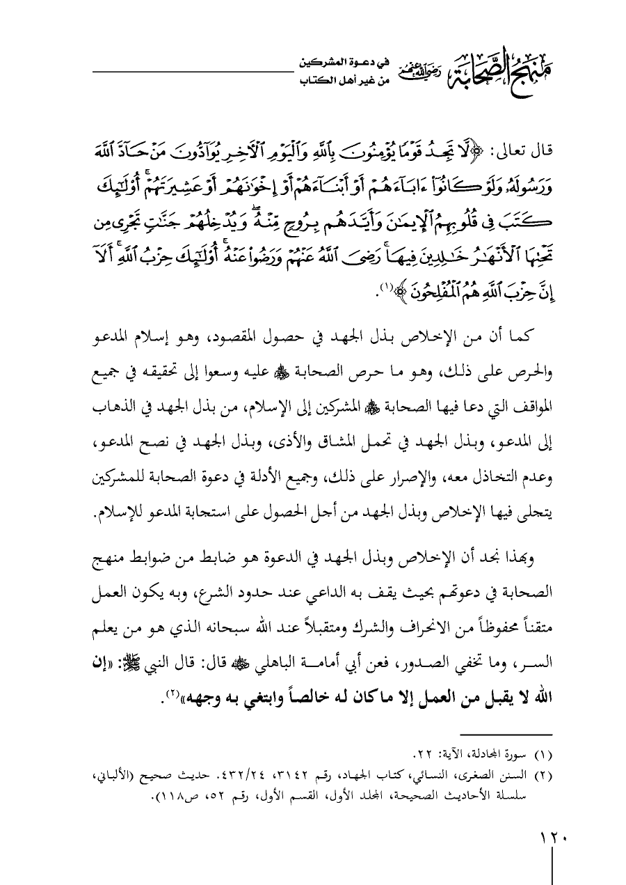 وبهذا نجد أن الإخلاص وبذل الجهد في الدعوة هو ضابط من ضوابط منهج الصحابة في دعوتهم بحيث يقف به الداعي عند حدود الشرع، وبه يكون العمل متقناً محفوظاً من الانحراف والشرك ومتقبلاً عند الله سبحانه الذي هو من يعلم السر، وما تخفي الصدور، فعن أبي أمامة الباهلي - رضي الله عنه - قال: قال النبي - صلى الله عليه وسلم -: (إن الله لا يقبل من العمل إلا ما كان له خالصاً وابتغي به وجهه ((¬٢).