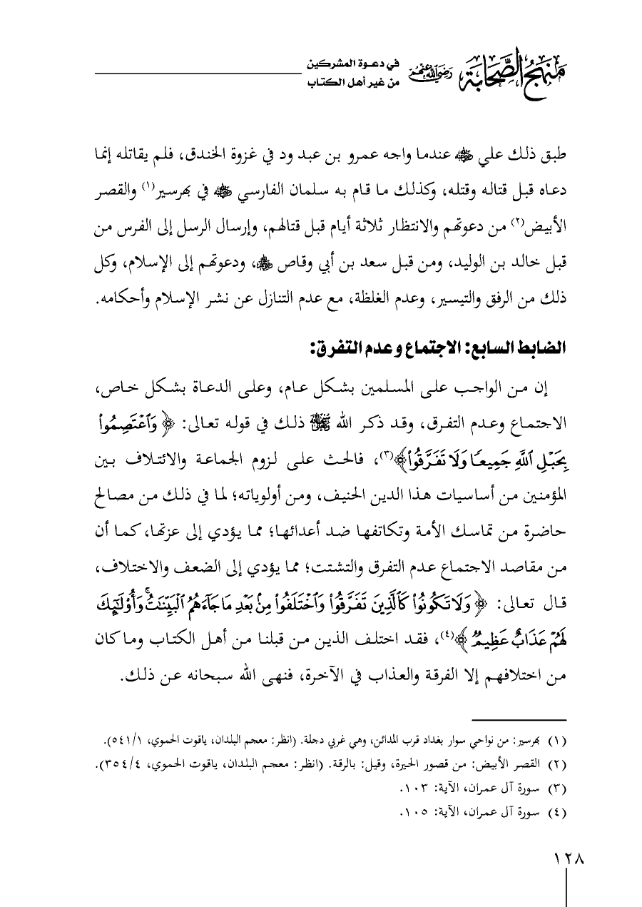 طبق ذلك علي - رضي الله عنه - عندما واجه عمرو بن عبد ود في غزوة الخندق، فلم يقاتله إنما دعاه قبل قتاله وقتله، وكذلك ما قام به سلمان الفارسي - رضي الله عنه - في بهرسير (¬١) والقصر الأبيض (¬٢) من دعوتهم والانتظار ثلاثة أيام قبل قتالهم، وإرسال الرسل إلى الفرس من قبل خالد بن الوليد، ومن قبل سعد بن أبي وقاص - رضي الله عنهم -، ودعوتهم إلى الإسلام، وكل ذلك من الرفق والتيسير، وعدم الغلظة، مع عدم التنازل عن نشر الإسلام وأحكامه.