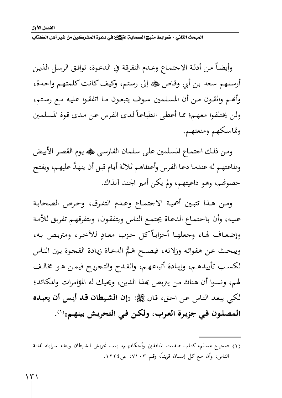 (¬١) صحيح مسلم، كتاب صفات المنافقين وأحكامهم، باب تحريش الشيطان وبعثه سراياه لفتنة الناس، وأن مع كل إنسان قريناً، رقم ٧١٠٣، ص ١٢٢٤.