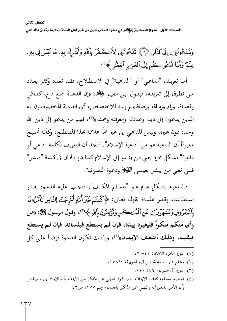 (¬٤) صحيح مسلم، كتاب الإيمان، باب كون النهي عن المنكر من الإيمان وأن الإيمان يزيد وينقص وأن الأمر بالمعروف والنهي عن المنكر واجبان، رقم ١٧٧، ص ٤٢.