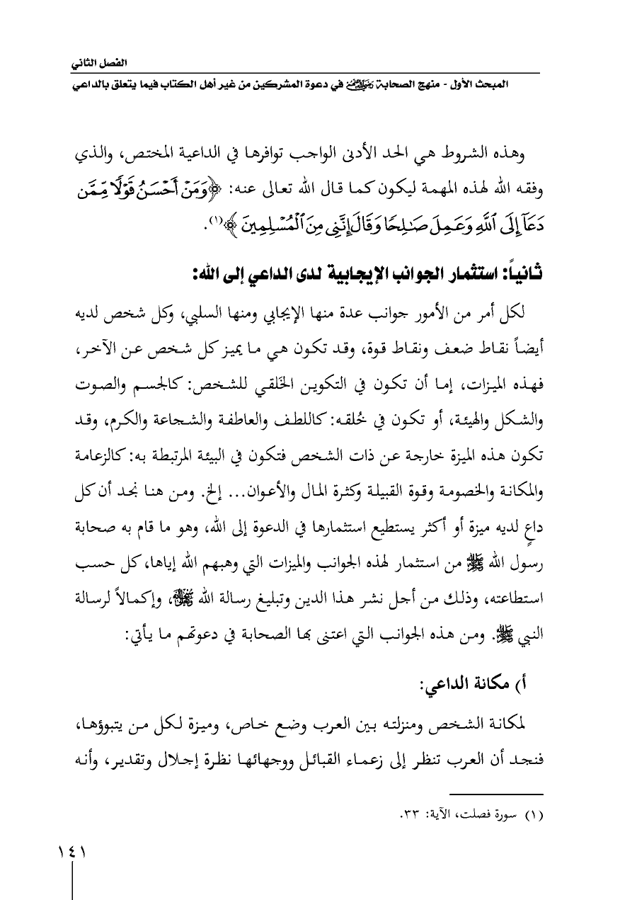 وهذه الشروط هي الحد الأدنى الواجب توافرها في الداعية المختص، والذي وفقه الله لهذه المهمة ليكون كما قال الله تعالى عنه: {وَمَنْ أَحْسَنُ قَوْلًا مِمَّنْ دَعَا إِلَى اللَّهِ وَعَمِلَ صَالِحًا وَقَالَ إِنَّنِي مِنَ الْمُسْلِمِينَ} (¬١).