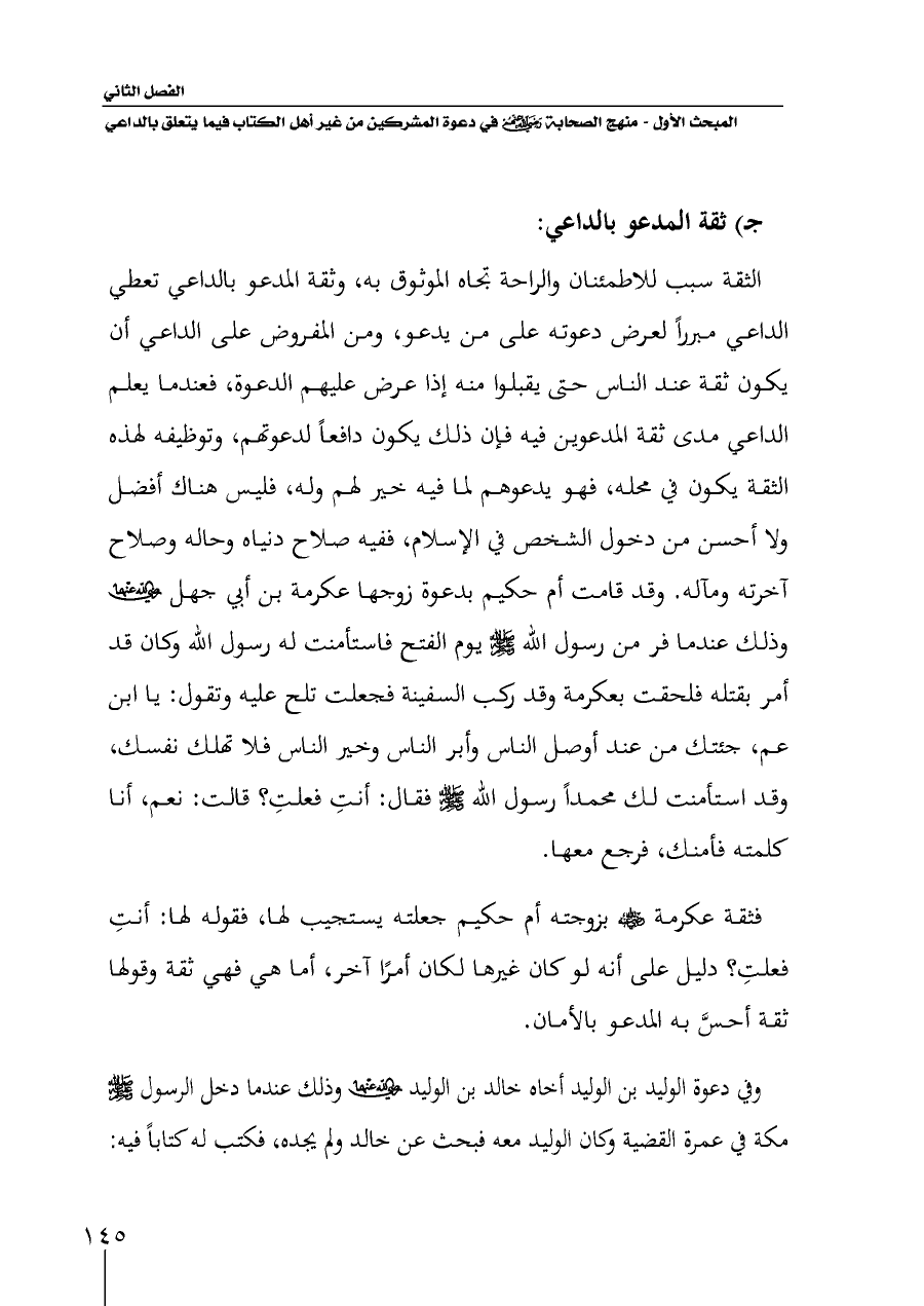 الثقة سبب للاطمئنان والراحة تجاه الموثوق به، وثقة المدعو بالداعي تعطي الداعي مبرراً لعرض دعوته على من يدعو، ومن المفروض على الداعي أن يكون ثقة عند الناس حتى يقبلوا منه إذا عرض عليهم الدعوة، فعندما يعلم الداعي مدى ثقة المدعوين فيه فإن ذلك يكون دافعاً لدعوتهم، وتوظيفه لهذه الثقة يكون في محله، فهو يدعوهم لما فيه خير لهم وله، فليس هناك أفضل ولا أحسن من دخول الشخص في الإسلام، ففيه صلاح دنياه وحاله وصلاح آخرته ومآله. وقد قامت أم حكيم بدعوة زوجها عكرمة بن أبي جهل - رضي الله عنهما - وذلك عندما فر من رسول الله - صلى الله عليه وسلم - يوم الفتح فاستأمنت له رسول الله وكان قد أمر بقتله فلحقت بعكرمة وقد ركب السفينة فجعلت تلح عليه وتقول: يا ابن عم، جئتك من عند أوصل الناس وأبر الناس وخير الناس فلا تهلك نفسك، وقد استأمنت لك محمداً رسول الله - صلى الله عليه وسلم - فقال: أنتِ فعلتِ؟ قالت: نعم، أنا كلمته فأمنك، فرجع معها.