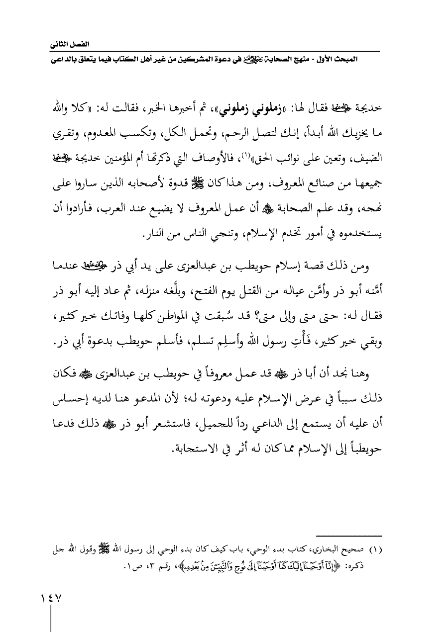 وهنا نجد أن أبا ذر - رضي الله عنه - قد عمل معروفاً في حويطب بن عبدالعزى - رضي الله عنه - فكان ذلك سبباً في عرض الإسلام عليه ودعوته له؛ لأن المدعو هنا لديه إحساس أن عليه أن يستمع إلى الداعي رداً للجميل، فاستشعر أبو ذر - رضي الله عنه - ذلك فدعا حويطباً إلى الإسلام مما كان له أثر في الاستجابة.