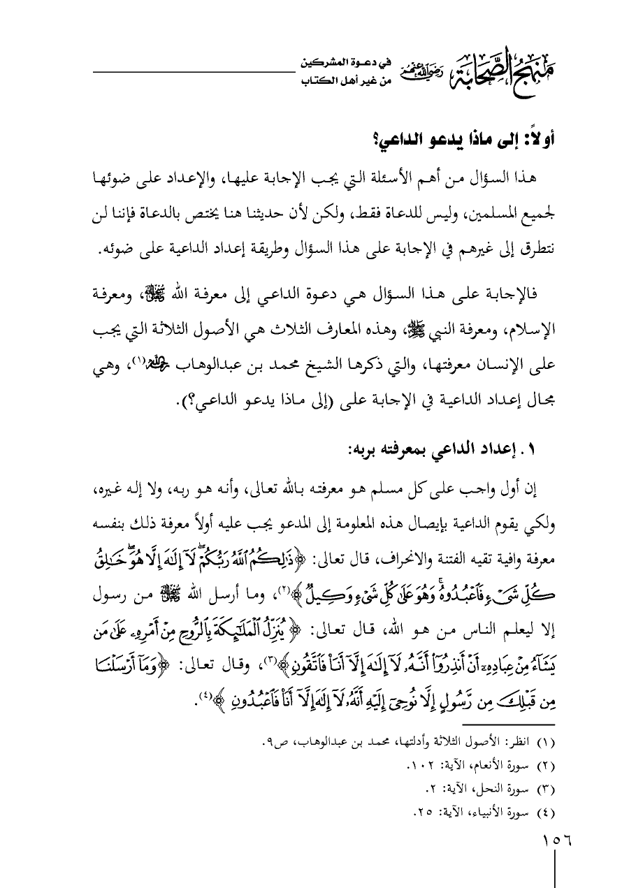 فالإجابة على هذا السؤال هي دعوة الداعي إلى معرفة الله - سبحانه وتعالى -، ومعرفة الإسلام، ومعرفة النبي - صلى الله عليه وسلم -، وهذه المعارف الثلاث هي الأصول الثلاثة التي يجب على الإنسان معرفتها، والتي ذكرها الشيخ محمد بن عبدالوهاب - رحمه الله - (¬١)، وهي مجال إعداد الداعية في الإجابة على (إلى ماذا يدعو الداعي؟).