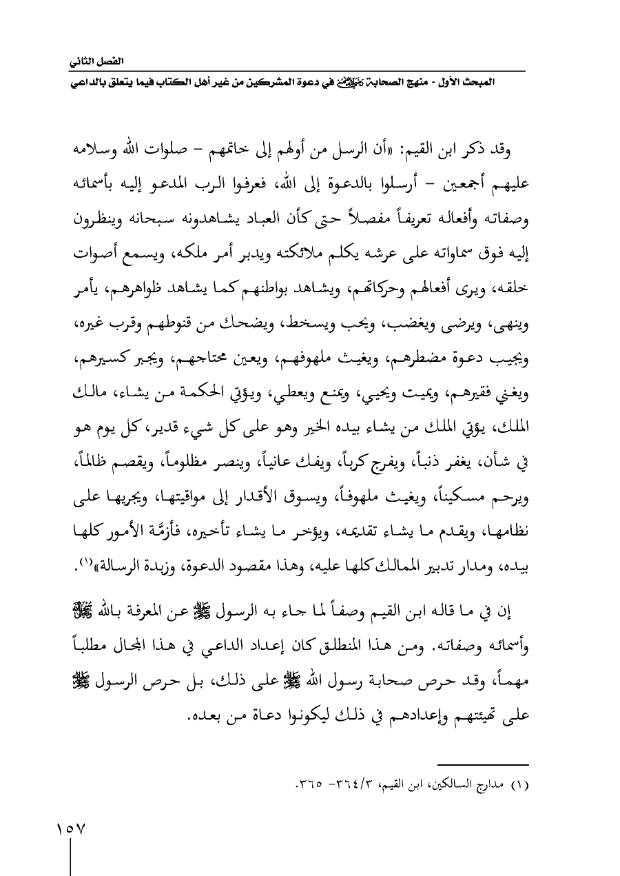 إن في ما قاله ابن القيم وصفاً لما جاء به الرسول - صلى الله عليه وسلم - عن المعرفة بالله - سبحانه وتعالى - وأسمائه وصفاته. ومن هذا المنطلق كان إعداد الداعي في هذا المجال مطلباً مهماً، وقد حرص صحابة رسول الله - صلى الله عليه وسلم - على ذلك، بل حرص الرسول - صلى الله عليه وسلم - على تهيئتهم وإعدادهم في ذلك ليكونوا دعاة من بعده.