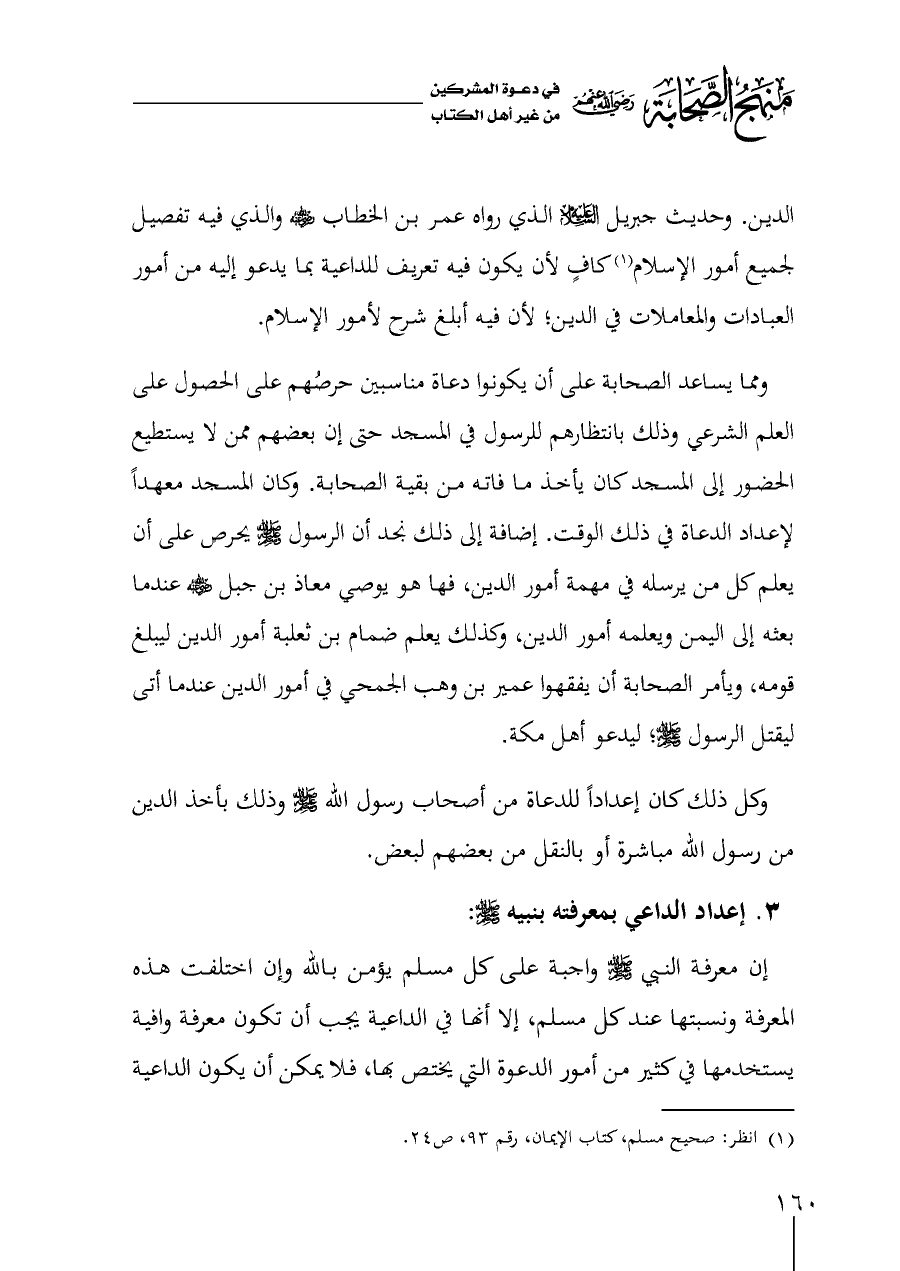 الدين. وحديث جبريل - عليه السلام - الذي رواه عمر بن الخطاب - رضي الله عنه - والذي فيه تفصيل لجميع أمور الإسلام (¬١) كافٍ لأن يكون فيه تعريف للداعية بما يدعو إليه من أمور العبادات والمعاملات في الدين؛ لأن فيه أبلغ شرح لأمور الإسلام.