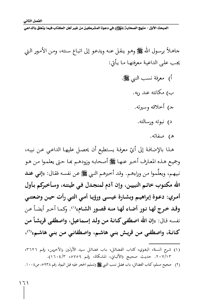 هذا بالإضافة إلى أيّ معرفة يستطيع أن يحصل عليها الداعي عن نبيه، وجميع هذه المعارف أخبر عنها - صلى الله عليه وسلم - أصحابه وزودهم بها حتى يعلموا من هو نبيهم، ويعلِّموا من وراءهم. وقد أخبرهم النبي - صلى الله عليه وسلم - عن نفسه فقال: (إني عند الله مكتوب خاتم النبيين، وإن آدم لمنجدل في طينته، وسأخبركم بأول أمري: دعوة إبراهيم وبشارة عيسى ورؤيا أمي التي رأت حين وضعتني وقد خرج لها نور أضاء لها منه قصور الشام ((¬١). وكما أخبر أيضاً عن نفسه قال: (إن الله اصطفى كنانة من ولد إسماعيل، واصطفى قريشاً من كنانة، واصطفى من قريش بني هاشم، واصطفاني من بني هاشم ((¬٢)،
