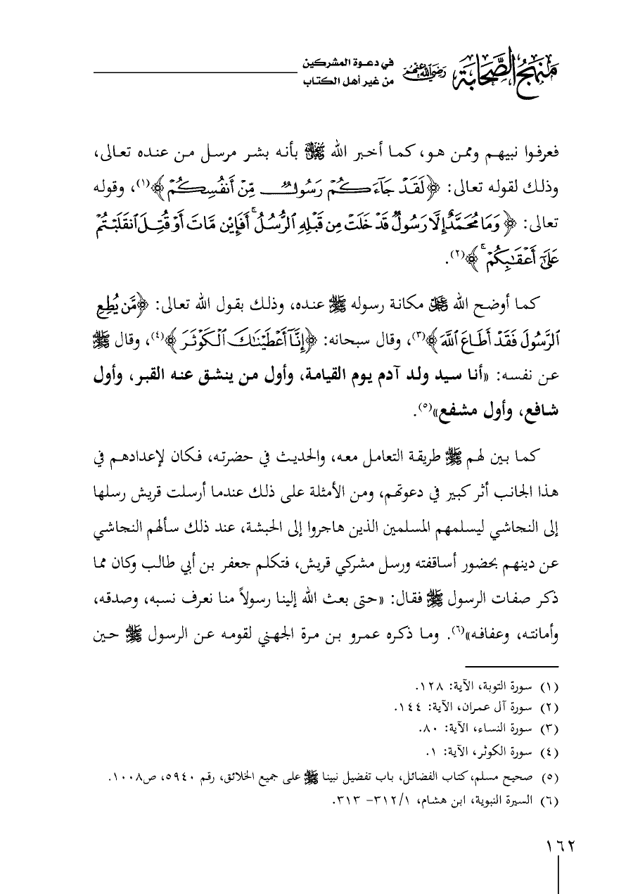 فعرفوا نبيهم وممن هو، كما أخبر الله - سبحانه وتعالى - بأنه بشر مرسل من عنده تعالى، وذلك لقوله تعالى: {لَقَدْ جَاءَكُمْ رَسُولٌ مِنْ أَنْفُسِكُمْ} (¬١)، وقوله تعالى: {وَمَا مُحَمَّدٌ إِلَّا رَسُولٌ قَدْ خَلَتْ مِنْ قَبْلِهِ الرُّسُلُ أَفَإِنْ مَاتَ أَوْ قُتِلَ انْقَلَبْتُمْ عَلَى أَعْقَابِكُمْ} (¬٢).