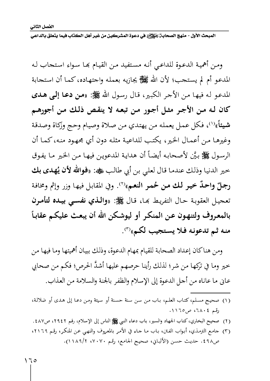 ومن أهمية الدعوة للداعي أنه مستفيد من القيام بها سواء استجاب له المدعو أم لم يستجب؛ لأن الله - سبحانه وتعالى - يجازيه بعمله واجتهاده، كما أن استجابة المدعو له فيها من الأجر الكبير، قال رسول الله - صلى الله عليه وسلم -: (من دعا إلى هدى كان له من الأجر مثل أجور من تبعه لا ينقص ذلك من أجورهم شيئاً ((¬١)، فكل عمل يعمله من يهتدي من صلاة وصيام وحج وزكاة وصدقة وغيرها من أعمال الخير، يكتب للداعية مثله دون أي مجهود منه، كما أن الرسول - صلى الله عليه وسلم - بيَّن لأصحابه أيضاً أن هداية المدعوين فيها من الخير ما يفوق خير الدنيا وذلك عندما قال لعلي بن أبي طالب - رضي الله عنه -: (فوالله لأن يُهدى بك رجلٌ واحدٌ خير لك من حُمر النعم ((¬٢). وفي المقابل فيها وزر وإثم ومخافة تعجيل العقوبة حال التفريط بها، قال - صلى الله عليه وسلم -: (والذي نفسي بيده لتأمرن بالمعروف ولتنهون عن المنكر أو ليوشكن الله أن يبعث عليكم عقاباً منه ثم تدعونه فلا يستجيب لكم ((¬٣).