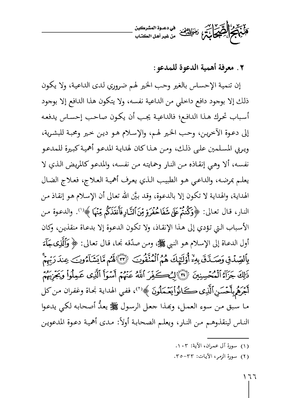 إن تنمية الإحساس بالغير وحب الخير لهم ضروري لدى الداعية، ولا يكون ذلك إلا بوجود دافع داخلي من الداعية نفسه، ولا يتكون هذا الدافع إلا بوجود أسباب تحرك هذا الدافع؛ فالداعية يجب أن يكون صاحب إحساس يدفعه إلى دعوة الآخرين، وحب الخير لهم، والإسلام هو دين خير ومحبة للبشرية، ويربي المسلمين على ذلك، ومن هذا كان لهداية المدعو أهمية كبيرة للمدعو نفسه، ألا وهي إنقاذه من النار وحمايته من نفسه، والمدعو كالمريض الذي لا يعلم بمرضه، والداعي هو الطبيب الذي يعرف أهمية العلاج، فعلاج الضال الهداية، والهداية لا تكون إلا بالدعوة، وقد بيَّن الله تعالى أن الإسلام هو إنقاذ من النار، قال تعالى: {وَكُنْتُمْ عَلَى شَفَا حُفْرَةٍ مِنَ النَّارِ فَأَنْقَذَكُمْ مِنْهَا} (¬١). والدعوة من الأسباب التي تؤدي إلى هذا الإنقاذ، ولا تكون الدعوة إلا بدعاة منقذين، وكان أول الدعاة إلى الإسلام هو النبي - صلى الله عليه وسلم -، ومن صدّقه نجا، قال تعالى: {وَالَّذِي جَاءَ بِالصِّدْقِ وَصَدَّقَ بِهِ أُولَئِكَ هُمُ الْمُتَّقُونَ (٣٣) لَهُمْ مَا يَشَاءُونَ عِنْدَ رَبِّهِمْ ذَلِكَ جَزَاءُ الْمُحْسِنِينَ (٣٤) لِيُكَفِّرَ اللَّهُ عَنْهُمْ أَسْوَأَ الَّذِي عَمِلُوا وَيَجْزِيَهُمْ أَجْرَهُمْ بِأَحْسَنِ الَّذِي كَانُوا يَعْمَلُونَ} (¬٢)، ففي الهداية نجاة وغفران من كل ما سبق من سوء العمل، وبهذا جعل الرسول - صلى الله عليه وسلم - يعدُّ أصحابه لكي يدعوا الناس لينقذوهم من النار، ويعلم الصحابة أولاً: مدى أهمية دعوة المدعوين