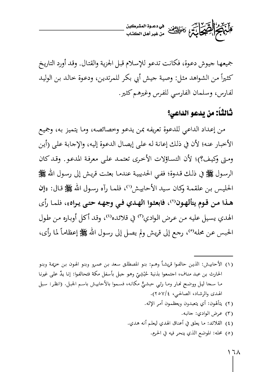 من إعداد الداعي للدعوة تعريفه بمن يدعو وخصائصه، وما يتميز به، وجميع الأخبار عنه؛ لأن في ذلك إعانة له على إيصال الدعوة إليه، والإجابة على (أين ومتى وكيف؟)؛ لأن التساؤلات الأخرى تعتمد على معرفة المدعو. وقد كان الرسول - صلى الله عليه وسلم - في ذلك قدوة؛ ففي الحديبية عندما بعثت قريش إلى رسول الله - صلى الله عليه وسلم - الحليس بن علقمة وكان سيد الأحابيش (¬١)، فلما رآه رسول الله - صلى الله عليه وسلم - قال: (إن هذا من قوم يتألهون (¬٢)، فابعثوا الهدي في وجهه حتى يراه (، فلما رأى الهدي يسيل عليه من عرض الوادي (¬٣) في قلائده (¬٤)، وقد أكل أوباره من طول الحبس عن محله (¬٥)، رجع إلى قريش ولم يصل إلى رسول الله - صلى الله عليه وسلم - إعظاماً لما رأى،